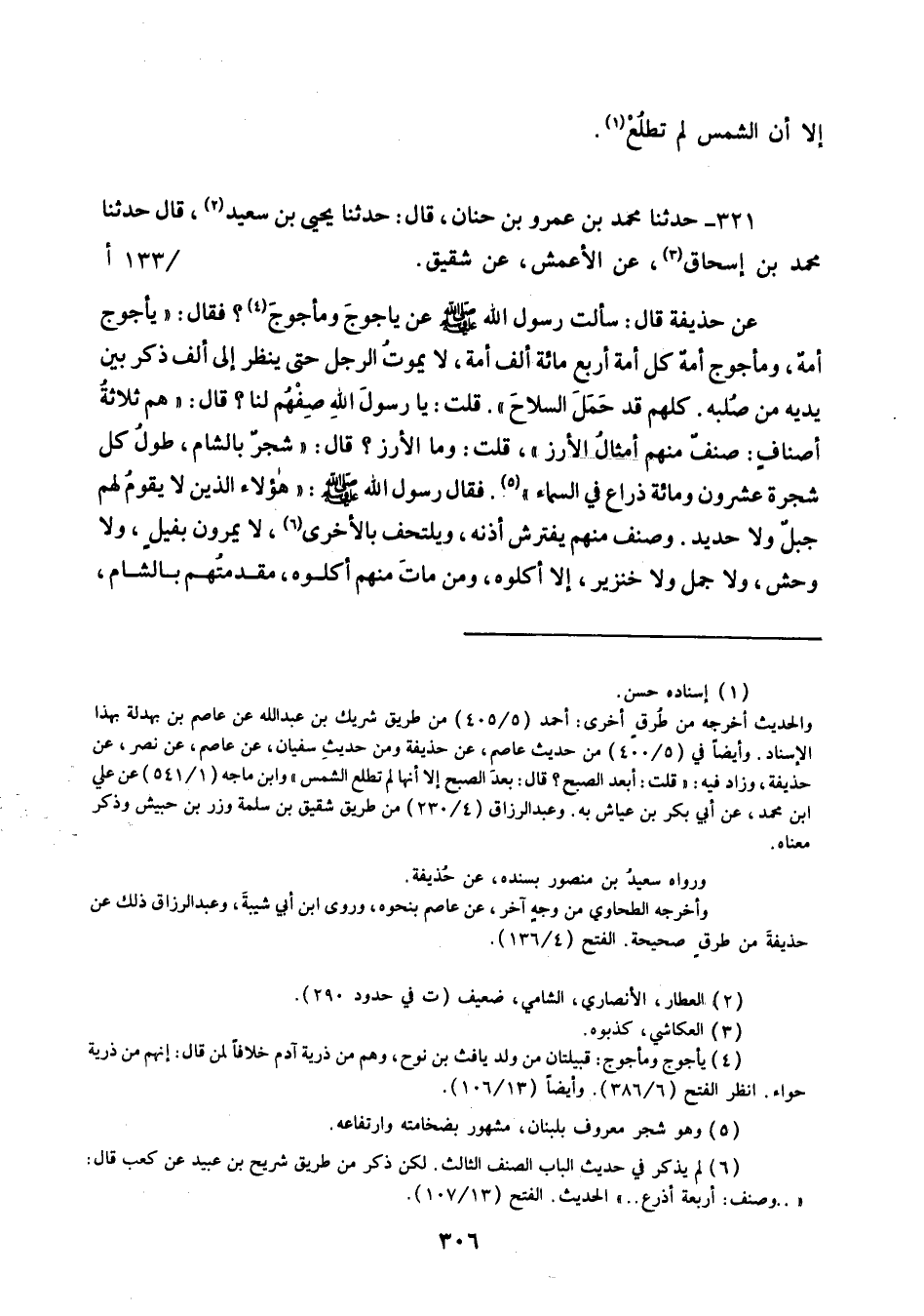 321 - حَدَّثَنَا مُحَمَّدُ بْنُ عَمْرِو بْنِ حَنَانٍ قَالَ: حَدَّثَنَا يَحْيَى بْنُ سَعِيدٍ قَالَ: حَدَّثَنَا مُحَمَّدُ بْنُ إِسْحَاقَ، عَنِ الْأَعْمَشِ، عَنْ شَقِيقٍ، عَنْ حُذَيْفَةَ قَالَ: سَأَلْتُ رَسُولَ اللَّهِ صَلَّى اللهُ عَلَيْهِ وَسَلَّمَ عَنْ يَأْجُوجَ وَمَأْجُوجَ , فَقَالَ: «§يَأْجُوجُ أُمَّةٌ وَمَأْجُوجُ أُمَّةٌ كُلُّ أُمَّةٍ أَرْبَعُ مِائَةِ أَلْفِ أُمَّةٍ لَا يَمُوتُ الرَّجُلُ حَتَّى يَنْظُرُ إِلَى أَلْفِ ذَكَرٍ بَيْنَ يَدَيْهِ مِنْ صُلْبِهِ كُلُّهُمْ قَدْ حَمَلَ السِّلَاحَ» قُلْتُ: يَا رَسُولَ اللَّهِ , صِفْهُمْ لَنَا قَالَ: «هُمْ ثَلَاثَةُ أَصْنَافٍ صِنْفٌ مِنْهُمْ أَمْثَالُ الْأَرْزِ» قُلْتُ: وَمَا الْأَرْزُ؟ قَالَ: «شَجَرٌ بِالشَّامِ طُولُ كُلِّ شَجَرَةٍ عِشْرُونَ وَمِائَةُ ذِرَاعٍ فِي السَّمَاءِ» , فَقَالَ رَسُولُ اللَّهِ صَلَّى اللهُ عَلَيْهِ وَسَلَّمَ: «هَؤُلَاءِ الَّذِينَ لَا يَقُومُ لَهُمْ جَبَلٌ , وَلَا حَدِيدٌ , وَصِنْفٌ مِنْهُمْ يَفْتَرِشُ أُذُنَهُ , وَيَلْتَحِفُ بِالْأُخْرَى لَا يَمُرُّونَ بِفِيلٍ وَلَا وَحْشٍ وَلَا جَمَلٍ وَلَا خِنْزِيرٍ إِلَّا أَكَلُوهُ , وَمَنْ مَاتَ مِنْهُمْ أَكَلُوهُ مُقَدَّمَتُهُمْ بِالشَّامِ -[307]- وَسَاقَتُهُمْ بِخُرَاسَانَ يَشْرَبُونَ أَنْهَارَ الْمَشْرِقِ وَبُحَيْرَةَ الطَّبَرِيَّةِ»