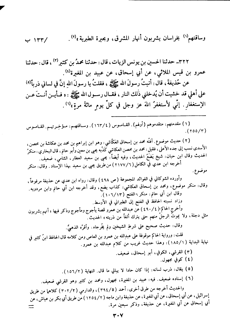 322 - حَدَّثَنَا الْحُسَيْنُ بْنُ يُونُسَ الزَّيَّاتُ قَالَ: حَدَّثَنَا مُحَمَّدُ بْنُ كَثِيرٍ قَالَ: حَدَّثَنَا عَمْرُو بْنُ قَيْسٍ الْمُلَائِيُّ، عَنْ أَبِي إِسْحَاقَ، عَنْ عُبَيْدِ بْنِ الْمُغِيرَةِ، عَنْ حُذَيْفَةَ قَالَ: أَتَيْتُ رَسُولَ اللَّهِ صَلَّى اللهُ عَلَيْهِ وَسَلَّمَ , فَقُلْتُ: يَا رَسُولَ اللَّهِ , إِنَّ فِيَ لِسَانِي ذَرَبًا عَلَى أَهْلِي قَدْ خَشِيتُ أَنْ يُدْخِلَنِي ذَلِكَ النَّارَ , فَقَالَ رَسُولُ اللَّهِ صَلَّى اللهُ عَلَيْهِ وَسَلَّمَ: «§فَأَيْنَ أَنْتَ عَنِ الِاسْتِغْفَارِ إِنِّي لَأَسْتَغْفِرُ اللَّهَ عَزَّ وَجَلَّ فِي كُلِّ يَوْمٍ مِائَةَ مَرَّةٍ»