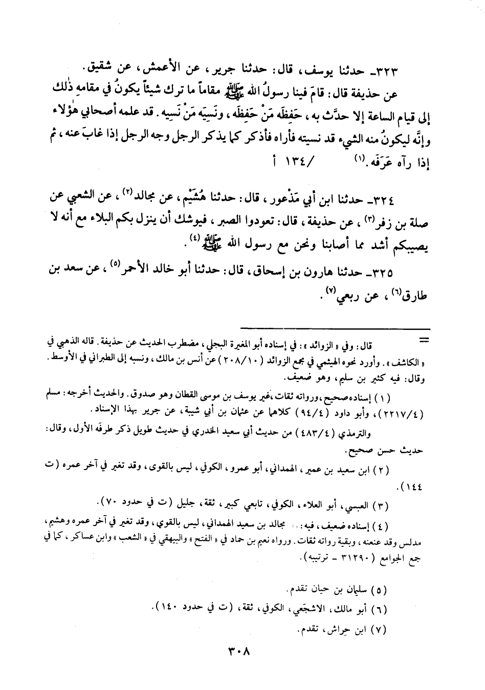 323 - حَدَّثَنَا يُوسُفُ قَالَ: حَدَّثَنَا جَرِيرٌ، عَنِ الْأَعْمَشِ، عَنْ شَقِيقٍ، عَنْ حُذَيْفَةَ قَالَ: «§قَامَ فِينَا رَسُولُ اللَّهِ صَلَّى اللهُ عَلَيْهِ وَسَلَّمَ مَقَامًا مَا تَرَكَ شَيْئًا يَكُونُ فِي مَقَامِهِ ذَلِكَ إِلَى قِيَامِ السَّاعَةِ إِلَّا حَدَّثَ بِهِ حَفِظَهُ مَنْ حَفِظَهُ وَنَسِيَهُ مَنْ نَسِيَهُ قَدْ عَلِمَهُ أَصْحَابِي هَؤُلَاءِ , وَإِنَّهُ لَيَكُونُ مِنْهُ الشَّيْءُ قَدْ نَسِيتُهُ فَأَرَاهُ , فَأَذْكُرُ كَمَا يَذْكُرُ الرَّجُلُ وَجْهَ الرَّجُلِ إِذَا غَابَ عَنْهُ , ثُمَّ إِذَا رَآهُ عَرَفَهُ»