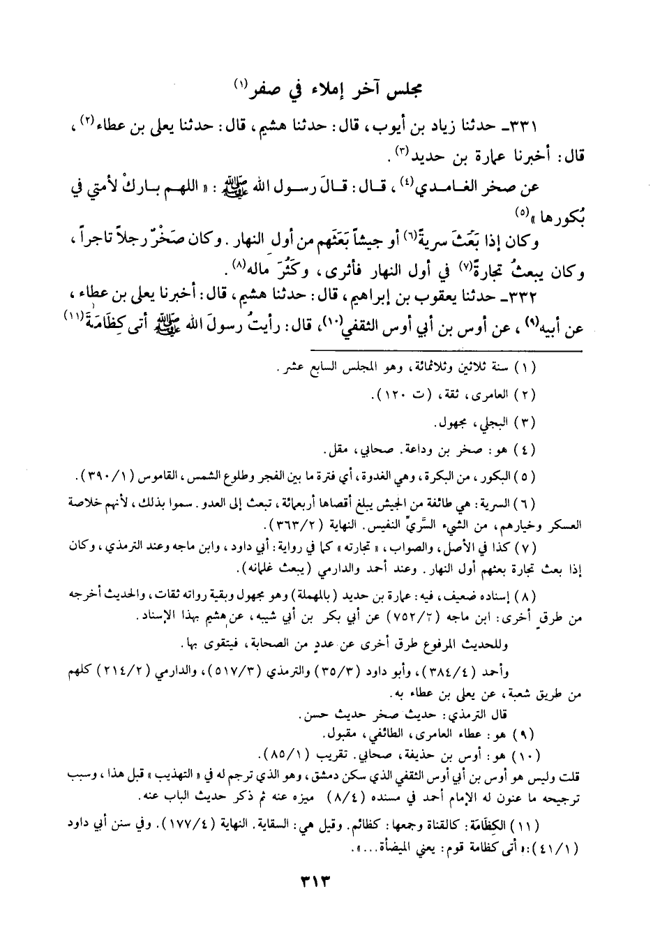 331 - حَدَّثَنَا زِيَادُ بْنُ أَيُّوبَ قَالَ: حَدَّثَنَا هُشَيْمٌ قَالَ: حَدَّثَنَا يَعْلَى بْنُ عَطَاءٍ قَالَ: أَخْبَرَنَا عُمَارَةُ بْنُ حَدِيدٍ، عَنْ صَخْرٍ الْغَامِدِيِّ قَالَ: قَالَ رَسُولُ اللَّهِ صَلَّى اللهُ عَلَيْهِ وَسَلَّمَ: «اللَّهُمَّ , §بَارِكْ لِأُمَّتِي فِي بُكُورِهَا» , وَكَانَ إِذَا بَعَثَ سَرِيَّةً أَوْ جَيْشًا بَعَثَهُمْ مِنْ أَوَّلِ النَّهَارِ , وَكَانَ صَخْرٌ رَجُلًا تَاجِرًا , وَكَانَ يَبْعَثُ تِجَارَةً فِي أَوَّلِ النَّهَارِ , فَأَثْرَى وَكَثُرَ مَالُهُ