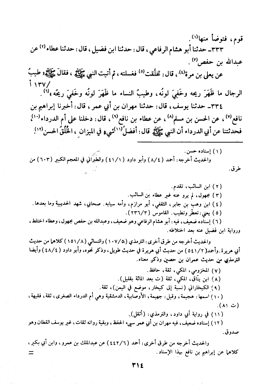 334 - حَدَّثَنَا يُوسُفُ قَالَ: حَدَّثَنَا مِهْرَانُ بْنُ أَبِي عُمَرَ قَالَ: أَخْبَرَنَا إِبْرَاهِيمُ بْنُ نَافِعٍ، عَنِ الْحَسَنِ بْنِ مُسْلِمٍ، عَنْ عَطَاءِ بْنِ نَافِعٍ قَالَ: دَخَلْنَا عَلَى أُمِّ الدَّرْدَاءِ فَحَدَّثَتْنَا، عَنْ أَبِي الدَّرْدَاءِ: أَنَّ النَّبِيَّ صَلَّى اللهُ عَلَيْهِ وَسَلَّمَ قَالَ: «§أَفْضَلُ شَيْءٍ فِي الْمِيزَانِ الْخُلُقُ الْحَسَنِ»