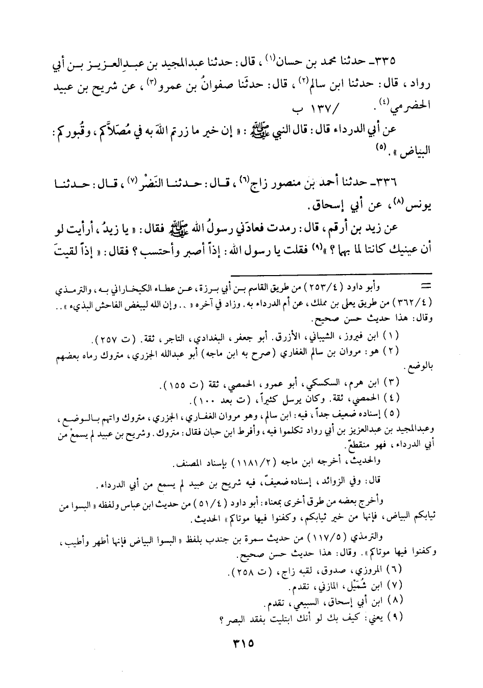 335 - حَدَّثَنَا مُحَمَّدُ بْنُ حَسَّانَ قَالَ: حَدَّثَنَا عَبْدُ الْمَجِيدِ بْنُ عَبْدِ الْعَزِيزِ بْنِ أَبِي رَوَّادٍ قَالَ: حَدَّثَنَا ابْنُ سَالِمٍ قَالَ: حَدَّثَنَا صَفْوَانُ بْنُ عَمْرٍو , عَنْ شُرَيْحِ بْنِ عُبَيْدٍ الْحَضْرَمِيِّ، عَنْ أَبِي الدَّرْدَاءِ قَالَ: قَالَ النَّبِيُّ صَلَّى اللهُ عَلَيْهِ وَسَلَّمَ: " إِنَّ §خَيْرَ مَا زُرْتُمُ اللَّهَ بِهِ فِي مُصَلَّاكُمْ وَقُبُورِكُمُ: الْبَيَاضُ "