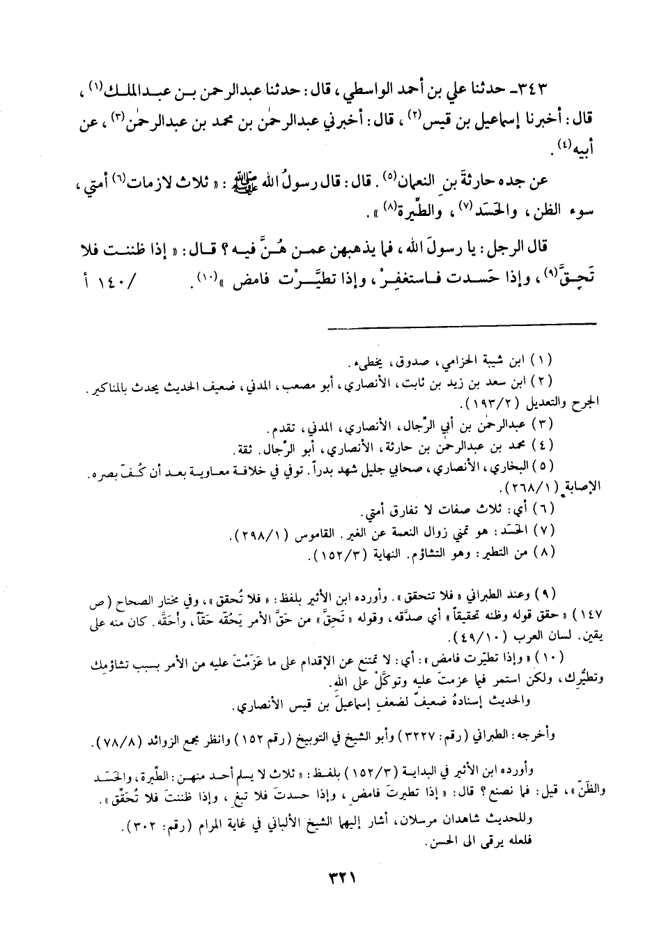 343 - حَدَّثَنَا عَلِيُّ بْنُ أَحْمَدَ الْوَاسِطِيُّ قَالَ: حَدَّثَنَا عَبْدُ الرَّحْمَنِ بْنُ عَبْدِ الْمَلِكِ قَالَ: أَخْبَرَنَا إِسْمَاعِيلُ بْنُ قَيْسٍ قَالَ: أَخْبَرَنِي عَبْدُ الرَّحْمَنِ بْنُ مُحَمَّدِ بْنِ عَبْدِ الرَّحْمَنِ، عَنْ أَبِيهِ , عَنْ جَدِّهِ حَارِثَةَ بْنِ النُّعْمَانِ قَالَ: قَالَ رَسُولُ اللَّهِ صَلَّى اللهُ عَلَيْهِ وَسَلَّمَ: " §ثَلَاثٌ لَازِمَاتُ أُمَّتِي: سُوءُ الظَّنِّ , وَالْحَسَدُ , وَالطِّيَرَةُ " , قَالَ الرَّجُلُ: يَا رَسُولَ اللَّهِ , فَمَا يُذْهِبْهُنَّ عَمَّنْ هُنَّ فِيهِ؟ قَالَ: «إِذَا ظَنَنْتَ فَلَا تَحِقَّ , وَإِذَا حَسَدْتَ فَاسْتَغْفِرْ , وَإِذَا تَطَيَّرْتَ فَامْضِ»