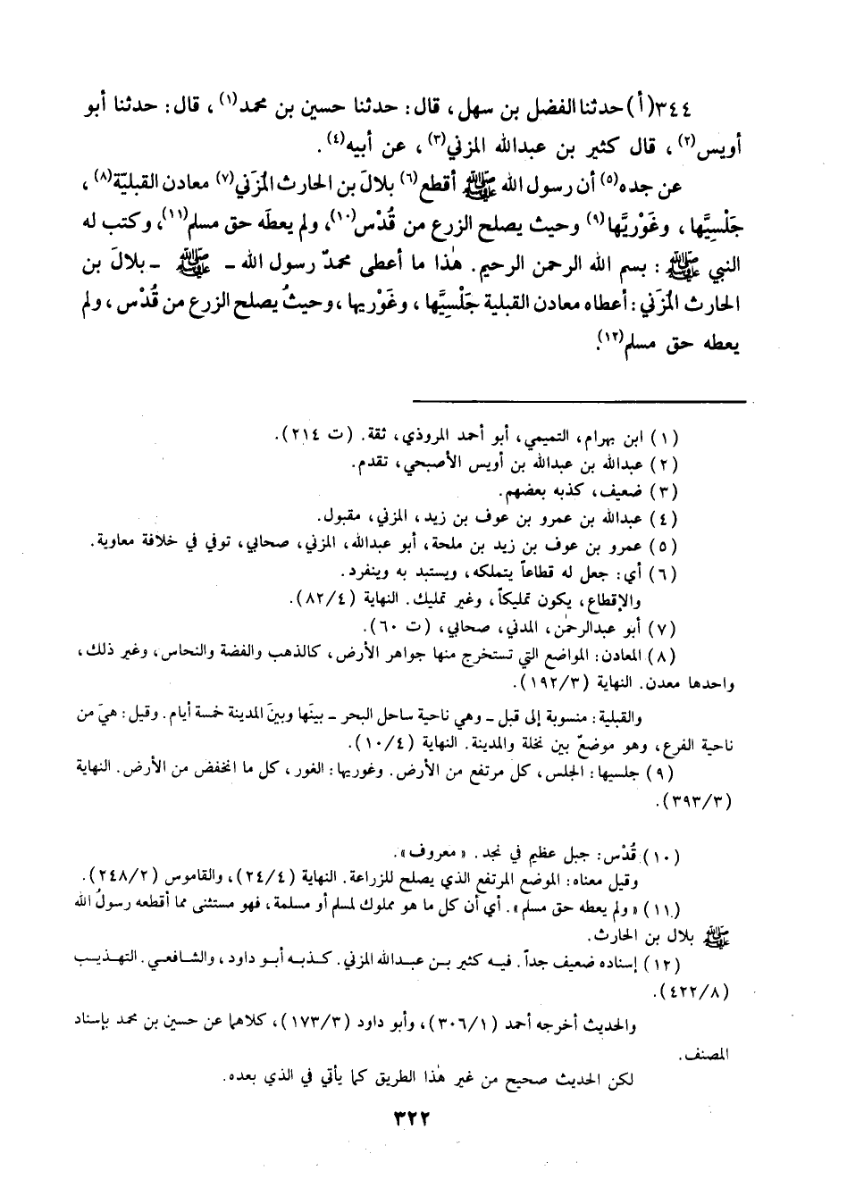 حَدَّثَنَا الْفَضْلُ بْنُ سَهْلٍ قَالَ: حَدَّثَنَا حُسَيْنُ بْنُ مُحَمَّدٍ قَالَ: حَدَّثَنَا أَبُو أُوَيْسٍ، قَالَ كَثِيرُ بْنُ عَبْدِ اللَّهِ الْمُزَنِيُّ , عَنْ أَبِيهِ، عَنْ جَدِّهِ، أَنَّ رَسُولَ اللَّهِ صَلَّى اللهُ عَلَيْهِ وَسَلَّمَ §أَقْطَعَ بِلَالَ بْنَ الْحَارِثِ الْمُزَنِيَّ مَعَادِنَ الْقَبَلِيَّةِ جَلْسِيَّهَا وَغَوْرِيَّهَا , وَحَيْثُ يَصْلُحُ الزَّرْعُ مِنْ قُدْسٍ , وَلَمْ يُعْطِهِ حَقَّ مُسْلِمٍ " وكتب له النَّبِيِّ صَلَّى اللهُ عَلَيْهِ وَسَلَّمَ: بِسْمِ اللَّهِ الرَّحْمَنِ الرَّحِيمِ هَذَا مَا أَعْطَى مُحَمَّدٌ رَسُولُ اللَّهِ صَلَّى اللهُ عَلَيْهِ وَسَلَّمَ بِلَالَ بْنَ الْحَارِثِ الْمُزَنِيَّ مَعَادِنَ الْقَبَلِيَّةِ جَلْسِيَّهَا وَغَوْرِيَّهَا , وَحَيْثُ يَصْلُحُ الزَّرْعُ مِنْ قُدْسٍ , وَلَمْ يُعْطِهِ حَقَّ مُسْلِمٍ " -[323]- حَدَّثَنَا الْفَضْلُ قَالَ: حَدَّثَنَا حُسَيْنُ بْنُ مُحَمَّدٍ قَالَ: حَدَّثَنَا أَبُو أُوَيْسٍ قَالَ: حَدَّثَنِي ثَوْرُ بْنُ زَيْدٍ مَوْلَى بَنِي الدِّيلِ بْنِ بَكْرٍ , عَنْ عِكْرِمَةَ , عَنِ ابْنِ عَبَّاسٍ عَنِ النَّبِيِّ صَلَّى اللهُ عَلَيْهِ وَسَلَّمَ مِثْلَهُ