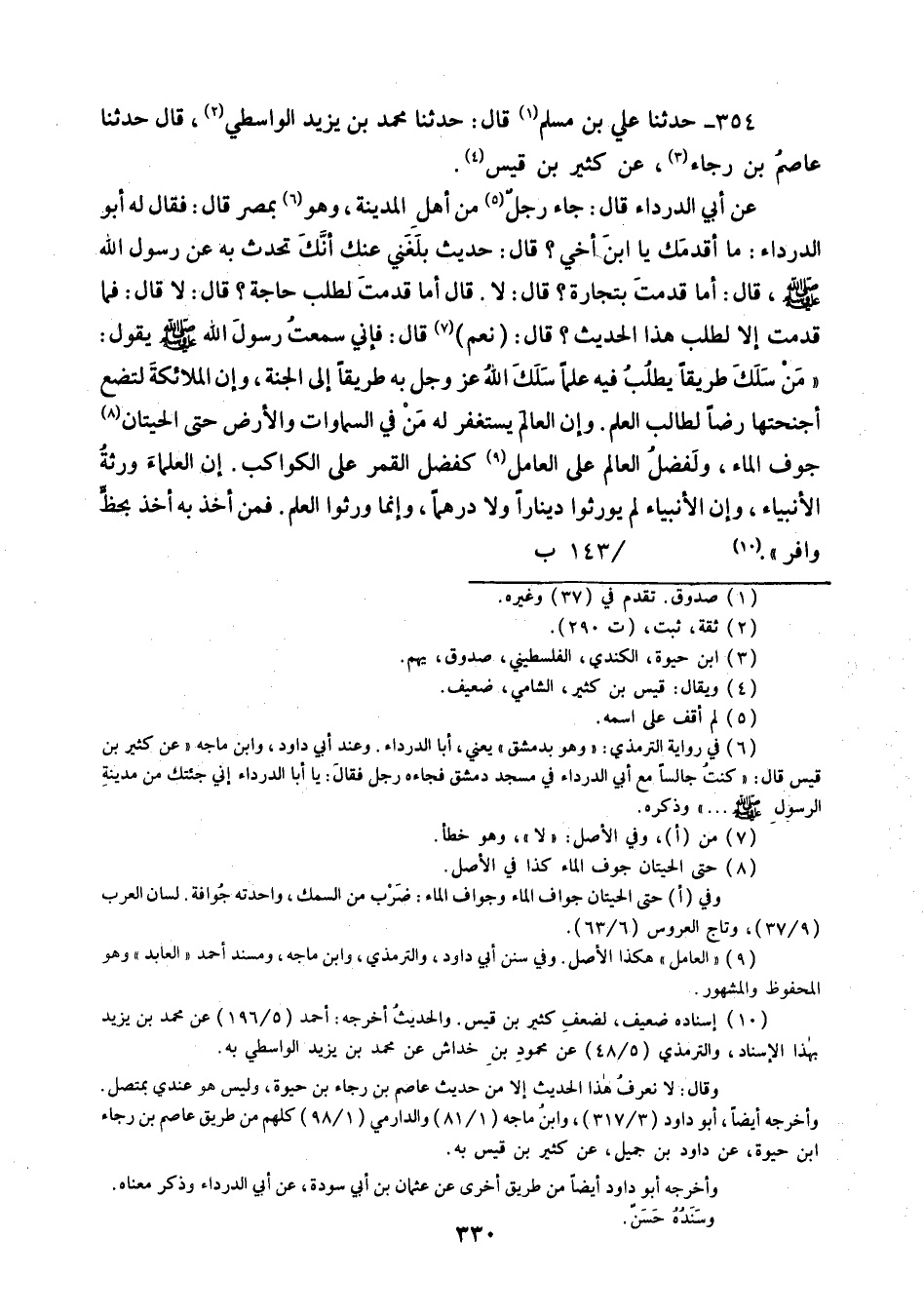 354 - حَدَّثَنَا عَلِيُّ بْنُ مُسْلِمٍ قَالَ: حَدَّثَنَا مُحَمَّدُ بْنُ يَزِيدَ الْوَاسِطِيُّ قَالَ: حَدَّثَنَا عَاصِمُ بْنُ رَجَاءٍ، عَنْ كَثِيرِ بْنِ قَيْسٍ، عَنْ أَبِي الدَّرْدَاءِ قَالَ: جَاءَ رَجُلٌ مِنْ أَهْلِ الْمَدِينَةِ وَهُوَ بِمِصْرَ قَالَ فَقَالَ لَهُ أَبُو الدَّرْدَاءِ: مَا أَقْدَمَكَ يَا ابْنَ أَخِي؟ قَالَ: حَدِيثٌ بَلَغَنِي عَنْكَ أَنَّكَ تُحَدِّثُ بِهِ عَنْ رَسُولِ اللَّهِ صَلَّى اللهُ عَلَيْهِ وَسَلَّمَ قَالَ: أَمَا قَدِمْتَ بِتِجَارَةٍ؟ قَالَ: لَا قَالَ: أَمَا قَدِمْتَ لِطَلَبِ حَاجَةٍ؟ قَالَ: لَا قَالَ: فَمَا قَدِمْتَ إِلَّا لِطَلَبِ هَذَا الْحَدِيثِ قَالَ: نَعَمْ قَالَ: فَإِنِّي سَمِعْتُ رَسُولَ اللَّهِ صَلَّى اللهُ عَلَيْهِ وَسَلَّمَ يَقُولُ: «§مَنْ سَلَكَ طَرِيقًا يَطْلُبُ فِيهِ عِلْمًا سَلَكَ اللَّهُ عَزَّ وَجَلَّ بِهِ طَرِيقًا إِلَى الْجَنَّةِ , وَإِنَّ الْمَلَائِكَةَ لَتَضَعُ أَجْنِحَتَهَا رِضًا لِطَالِبِ الْعِلْمِ , وَإِنَّ الْعَالِمَ يَسْتَغْفِرُ لَهُ مَنْ فِي السَّمَاوَاتِ وَالْأَرْضِ حَتَّى الْحِيتَانُ جَوْفَ الْمَاءِ , وَلَفَضْلُ الْعَالِمِ عَلَى الْعَامِلِ كَفَضْلِ الْقَمَرِ عَلَى الْكَوَاكِبِ إِنَّ الْعُلَمَاءَ وَرَثَةُ الْأَنْبِيَاءِ , وَإِنَّ الْأَنْبِيَاءَ لَمْ يُوَرِّثُوا دِينَارًا وَلَا دِرْهَمًا , وَإِنَّمَا وَرَّثُوا الْعِلْمَ فَمَنْ أَخَذَ بِهِ أَخَذَ بِحَظٍّ وَافِرٍ»