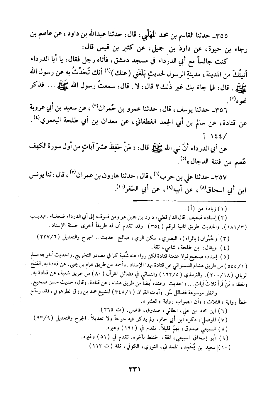 356 - حَدَّثَنَا يُوسُفُ قَالَ: حَدَّثَنَا عَمْرُو بْنُ حُمْرَانَ، عَنْ سَعِيدِ بْنِ أَبِي عَرُوبَةَ، عَنْ قَتَادَةَ، عَنْ سَالِمِ بْنِ أَبِي الْجَعْدِ الْغَطَفَانِيِّ، عَنْ مَعْدَانَ بْنِ أَبِي طَلْحَةَ الْيَعْمُرِيِّ، عَنْ أَبِي الدَّرْدَاءِ أَنَّ نَبِيَّ اللَّهِ صَلَّى اللهُ عَلَيْهِ وَسَلَّمَ قَالَ: «§مَنْ حَفِظَ عَشْرَ آيَاتٍ مِنْ أَوَّلِ سُورَةِ الْكَهْفِ عُصِمَ مِنْ فِتْنَةِ الدَّجَّالِ»