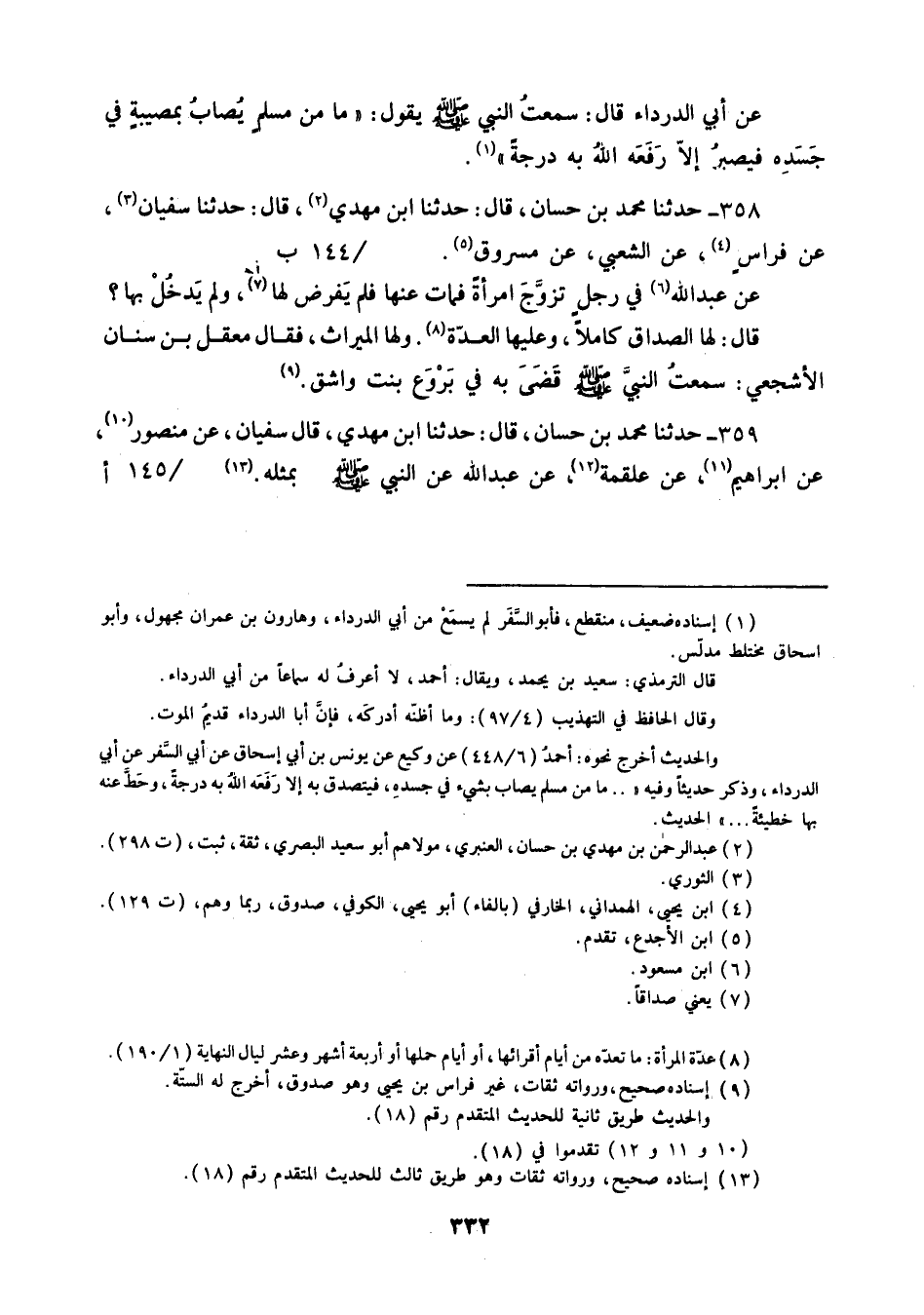 359 - حَدَّثَنَا مُحَمَّدُ بْنُ حَسَّانَ قَالَ: حَدَّثَنَا ابْنُ مَهْدِيٍّ قَالَ سُفْيَانُ , عَنْ مَنْصُورٍ، عَنْ إِبْرَاهِيمَ، عَنْ عَلْقَمَةَ، عَنْ عَبْدِ اللَّهِ، عَنِ النَّبِيِّ صَلَّى اللهُ عَلَيْهِ وَسَلَّمَ بِمِثْلِهِ