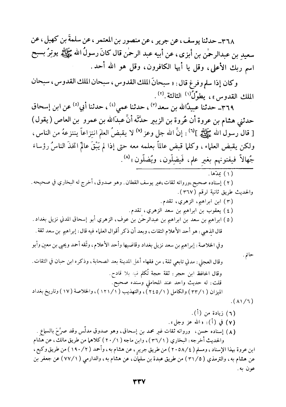 369 - حَدَّثَنَا عُبَيْدُ اللَّهِ بْنُ سَعْدٍ، حَدَّثَنَا عَمِّي، حَدَّثَنَا أَبِي، عَنِ ابْنِ إِسْحَاقَ، حَدَّثَنِي هِشَامُ بْنُ عُرْوَةَ، أَنَّ عُرْوَةَ بْنَ الزُّبَيْرِ حَدَّثَهُ، أَنَّ عَبْدَ اللَّهِ بْنَ عَمْرِو بْنِ الْعَاصِ يَقُولُ: قَالَ رَسُولُ اللَّهِ صَلَّى اللهُ عَلَيْهِ وَسَلَّمَ: «إِنَّ §اللَّهَ جَلَّ وَعَزَّ لَا يَقْبِضُ الْعِلْمَ انْتِزَاعًا يَنْتَزِعُهُ مِنَ النَّاسِ , وَلَكِنْ يَقْبِضُ الْعُلَمَاءَ , وَكُلَّمَا قَبَضَ عَالِمًا بِعِلْمِهِ مَعَهُ حَتَّى إِذَا لَمْ يَبْقَ عَالِمٌ اتَّخَذَ النَّاسُ رُؤَسَاءَ جُهَّالًا , فَيُفْتُونَهُمْ بِغَيْرِ عِلْمٍ فَيَضِلُّونَ وَيُضِلُّونَ»