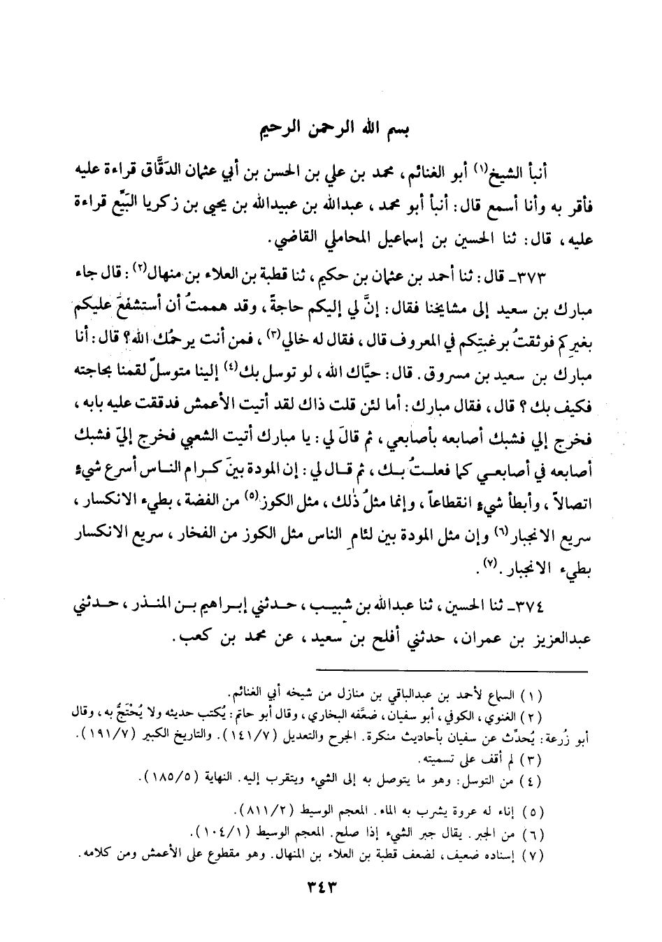 373 - قَالَ: ثنا أَحْمَدُ بْنُ عُثْمَانَ بْنِ حَكِيمٍ، ثنا قُطْبَةُ بْنُ الْعَلَاءِ بْنِ مِنْهَالٍ قَالَ: جَاءَ مُبَارَكُ بْنُ سَعِيدٍ إِلَى مَشَايِخِنَا , فَقَالَ: إِنَّ لِيَ إِلَيْكُمْ حَاجَةً , وَقَدْ هَمَمْتُ أَنْ أَسْتَشْفِعَ عَلَيْكُمْ بِغَيْرِكُمْ , فَوَثِقْتُ بِرَغْبَتِكُمْ فِي الْمَعْرُوفِ قَالَ , فَقَالَ لَهُ خَالِي: فَمَنْ أَنْتَ يَرْحَمُكَ اللَّهُ؟ قَالَ: أَنَا مُبَارَكُ بْنُ سَعِيدِ بْنِ مَسْرُوقٍ قَالَ: حَيَّاكَ اللَّهُ لَوْ تَوَسَّلَ بِكَ إِلَيْنَا مُتَوَسِّلٌ لَقُمْنَا بِحَاجَتِهِ , فَكَيْفَ بِكَ قَالَ , فَقَالَ مُبَارَكٌ: أَمَا لَئِنْ قُلْتَ ذَاكَ لَقَدْ أَتَيْتُ الْأَعْمَشَ , فَدَقَقْتُ عَلَيْهِ بَابَهُ , فَخَرَجَ إِلَيَّ فَشَبَّكَ أَصَابِعَهُ بِأَصَابِعِي , ثُمَّ قَالَ لِي: يَا مُبَارَكُ , أَتَيْتُ الشَّعْبِيَّ فَخَرَجَ إِلَيَّ فَشَبَّكَ أَصَابِعَهُ فِي أَصَابِعِي كَمَا فَعَلْتُ بِكَ , ثُمَّ قَالَ لِي: «إِنَّ §الْمَوَدَّةَ بَيْنَ كِرَامِ النَّاسِ أَسْرَعُ شَيْءٍ إِتِصَالًا وَأَبْطَأُ شَيْءٍ انْقِطَاعًا , وَإِنَّمَا مَثَلُ ذَلِكَ مَثَلُ الْكُوزِ مِنَ الْفِضَّةِ بَطِيءُ الِانْكِسَارِ سَرِيعُ الِانْجِبَارِ , وَإِنَّ مَثَلَ الْمَوَدَّةِ بَيْنَ لِئَامِ النَّاسِ مَثَلُ الْكُوزِ مِنَ الْفَخَّارِ سَرِيعُ الِانْكِسَارِ بَطِيءُ الِانْجِبَارِ»