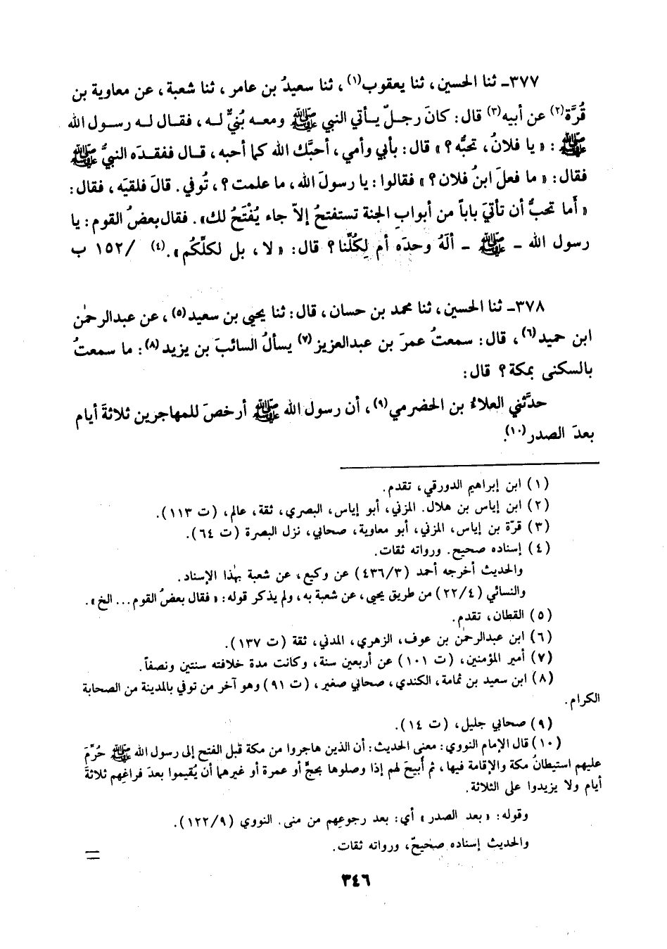 378 - ثنا الْحُسَيْنُ ثنا مُحَمَّدُ بْنُ حَسَّانَ قَالَ ثنا يَحْيَى بْنُ سَعِيدٍ، عَنْ عَبْدِ الرَّحْمَنِ بْنِ حُمَيْدٍ قَالَ: سَمِعْتُ عُمَرَ بْنَ عَبْدِ الْعَزِيزِ، يَسْأَلُ السَّائِبَ بْنَ يَزِيدَ: مَا سَمِعْتَ بِالسُّكْنَى بِمَكَّةَ؟ قَالَ: حَدَّثَنِي الْعَلَاءُ بْنُ الْحَضْرَمِيِّ، أَنَّ رَسُولَ اللَّهِ صَلَّى اللهُ عَلَيْهِ وَسَلَّمَ: «§أَرْخَصَ لِلْمُهَاجِرِينَ ثَلَاثَةَ أَيَّامٍ بَعْدَ الصَّدْرِ»