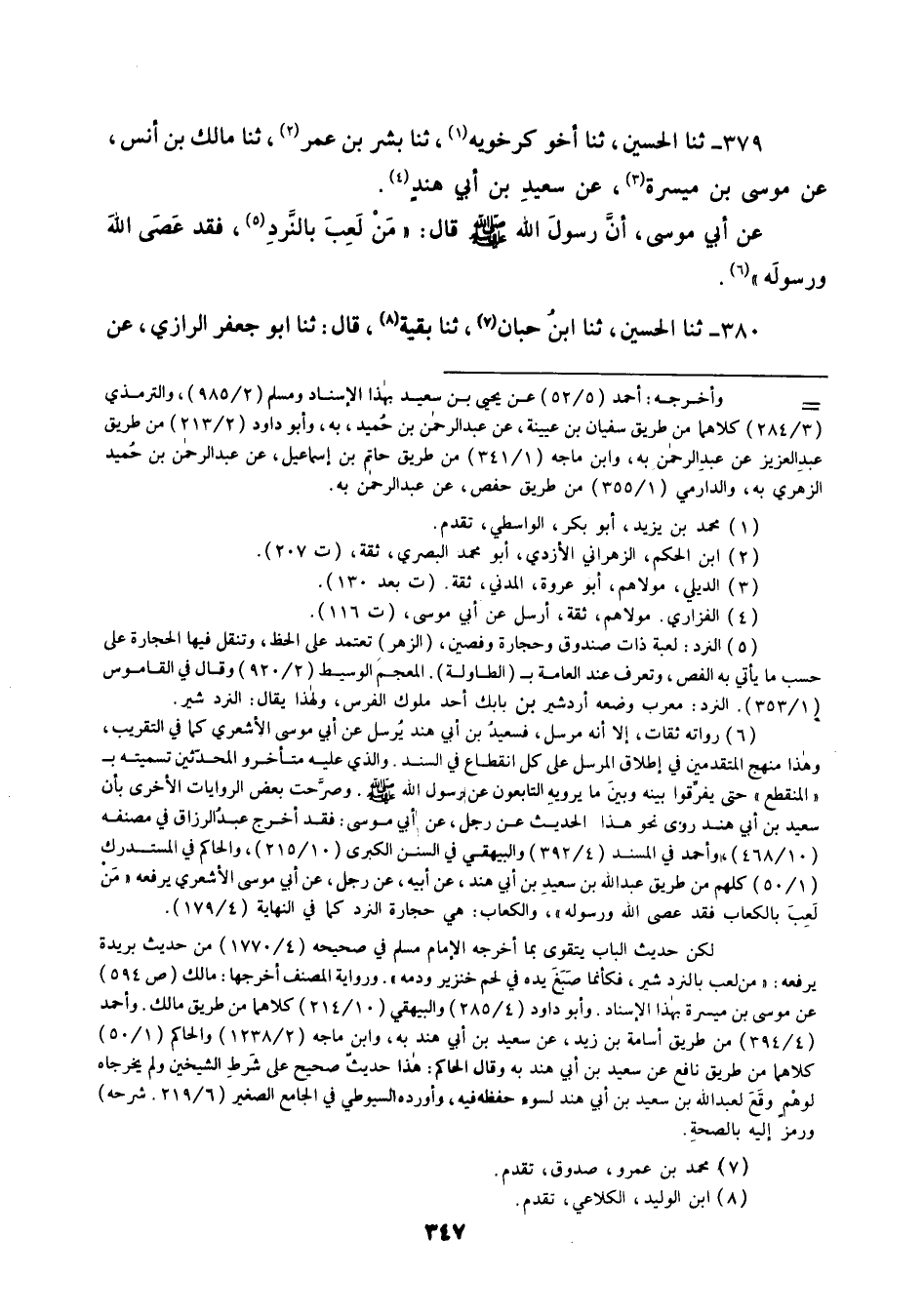 379 - ثنا الْحُسَيْنُ ثنا الْحُسَيْنُ ثنا أَخُو كَرْخَوَيْهِ , ثنا بِشْرُ بْنُ عُمَرَ، ثنا مَالِكُ بْنُ أَنَسٍ، عَنْ مُوسَى بْنِ مَيْسَرَةَ، عَنْ سَعِيدِ بْنِ أَبِي هِنْدَ، عَنْ أَبِي مُوسَى، أَنَّ رَسُولَ اللَّهِ صَلَّى اللهُ عَلَيْهِ وَسَلَّمَ قَالَ: «§مَنْ لَعِبَ بِالنَّرْدِ فَقَدْ عَصَى اللَّهَ وَرَسُولَهُ»