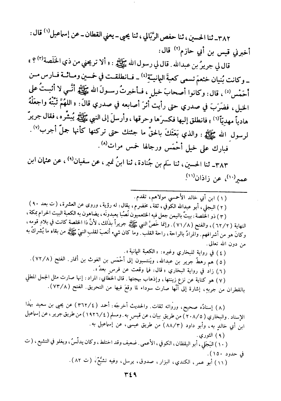 382 - ثنا الْحُسَيْنُ ثنا حَفْصٌ الرَّبَالِيُّ، ثنا يَحْيَى يَعْنِي الْقَطَّانَ، عَنْ إِسْمَاعِيلَ قَالَ: أَخْبَرَنِي قَيْسُ بْنُ أَبِي حَازِمٍ قَالَ: قَالَ لِي جَرِيرُ بْنُ عَبْدِ اللَّهِ: قَالَ لِي رَسُولُ اللَّهِ صَلَّى اللهُ عَلَيْهِ وَسَلَّمَ: «§أَلَا تُرِيحُنِي مِنْ ذِي الْخَلَصَةِ» , وَكَانَتْ بُنْيَانُ خَثْعَمَ تُسَمَّى كَعْبَةَ الْيَمَانِيَةِ , فَانْطَلَقْتُ فِي خَمْسِينَ وَمِائَةِ فَارِسٍ مِنْ أَحْمَسَ قَالَ: وَكَانُوا أَصْحَابَ خَيْلٍ , فَأَخْبَرْتُ رَسُولَ اللَّهِ صَلَّى اللهُ عَلَيْهِ وَسَلَّمَ: إِنِّي لَا أَثْبُتُ عَلَى الْخَيْلِ , فَضَرَبَ فِي صَدْرِي حَتَّى رَأَيْتُ أَثَرَ أَصَابِعَهُ فِي صَدْرِي قَالَ: «اللَّهُمَّ , ثَبِّتْهُ وَاجْعَلْهُ هَادِيًا مَهْدِيًّا» , فَانْطَلَقَ إِلَيْهَا , فَكَسَرَهَا , وَحَرَّقَهَا , وَأَرْسَلَ إِلَى النَّبِيِّ صَلَّى اللهُ عَلَيْهِ وَسَلَّمَ يُبَشِّرُهُ , فَقَالَ: جَرِيرٌ لِرَسُولِ اللَّهِ صَلَّى اللهُ عَلَيْهِ وَسَلَّمَ: وَالَّذِي بَعَثَكَ بِالْحَقِّ , مَا جِئْتُكَ حَتَّى تَرَكْتُهَا كَأَنَّهَا جَمَلٌ أَجْرَبُ , فَبَارَكَ عَلَى خَيْلِ أَحْمَسَ وَرِجَالِهَا خَمْسَ مَرَّاتٍ "