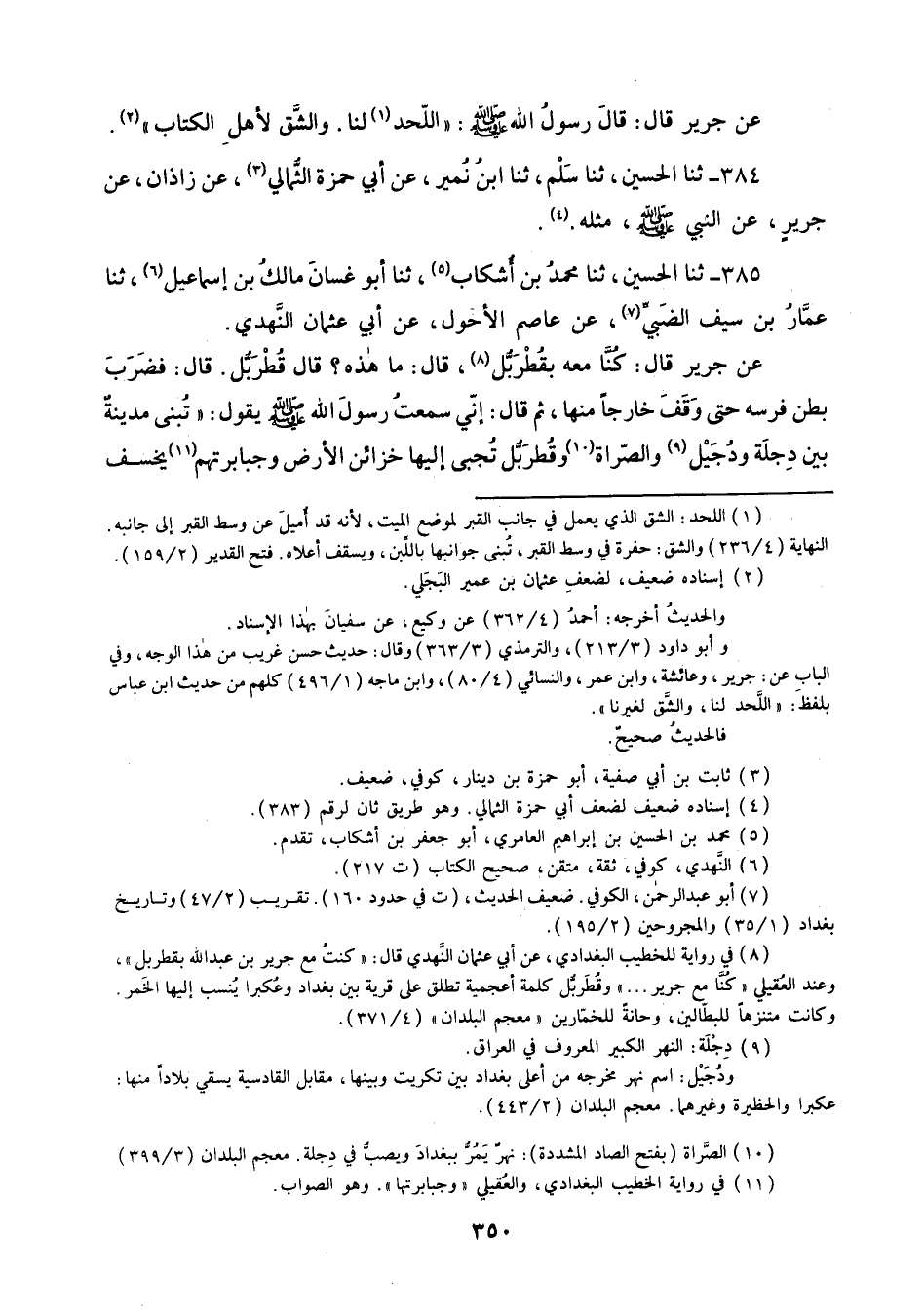 385 - ثنا الْحُسَيْنُ، ثنا مُحَمَّدُ بْنُ إِشْكَابَ، ثنا أَبُو غَسَّانَ مَالِكُ بْنُ إِسْمَاعِيلَ , ثنا عَمَّارُ بْنُ سَيْفٍ الضَّبِّيُّ، عَنْ عَاصِمٍ الْأَحْوَلِ، عَنْ أَبِي عُثْمَانَ الْهِنْدِيِّ، عَنْ جَرِيرٍ قَالَ: كُنَّا مَعَهُ بِقُطْرَبُّلَ قَالَ: مَا هَذِهِ؟ قَالَ: قُطْرَبُّلُ، قَالَ: فَضَرَبَ بَطْنَ فَرَسِهِ حَتَّى وَقَفَ خَارِجًا مِنْهَا , ثُمَّ قَالَ: إِنِّي سَمِعْتُ رَسُولَ اللَّهِ صَلَّى اللهُ عَلَيْهِ وَسَلَّمَ يَقُولُ: «§تُبْنَى مَدِينَةٌ بَيْنَ دِجْلَةَ وَدُجَيْلٍ , وَالصَّرَاةِ وَقُطْرَبُّلَ تُجْبَى إِلَيْهَا خَزَائِنُ الْأَرْضِ , وَجَبَابِرَتُهَا يَخْسِفُ -[351]- بِأَهْلِهَا , فَلَهِيَ أَسْرَعُ هَوِيًّا فِي الْأَرْضِ مِنْ وَتَدِ الْحَدِيدِ فِي الْأَرْضِ الرَّخْوَةِ» قَالَ عَمَّارٌ: سَمِعْتُهُ يُحَدِّثُ بِهِ رَجُلًا قَالَ أَبُو غَسَّانَ: فَقُلْتُ لَهُ: أَبَا سُفْيَانَ قَالَ: قَدْ أَخَذَ عَلَيَّ أَنْ لَا أُسَمِّيَهُ , وَلَمْ يَقُلْ لِي قَالَ عَمَّارٌ: فَشَكَكْتُ فِي بَعْضِهِ , فَقَوَّمَنِي فِيهِ , وَقَدْ حَفِظْتُ إِسْنَادَهُ مِنْ عَاصِمٍ , وَالْحَدِيثَ إِلَّا الشَّيْءَ
