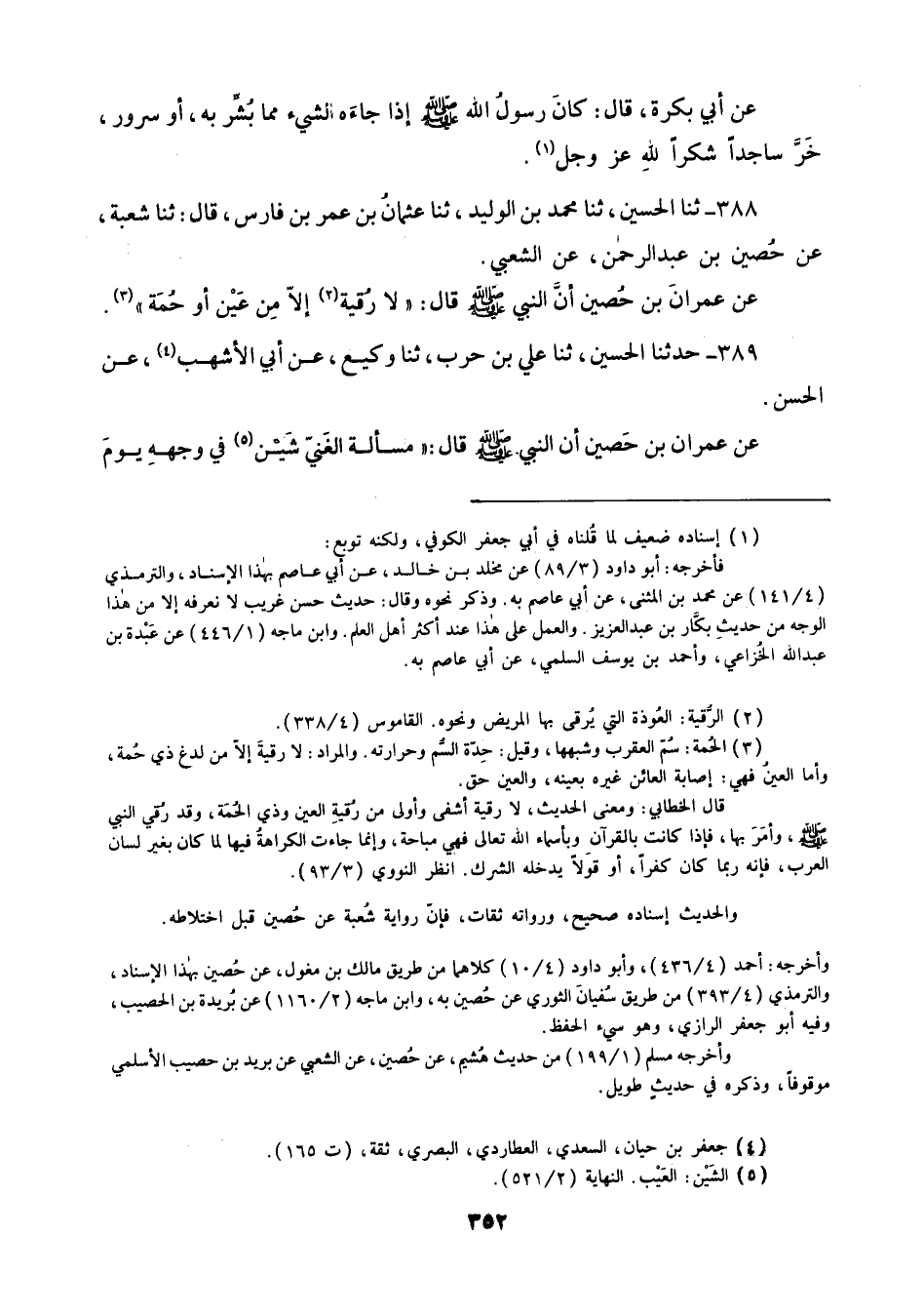 388 - ثنا الْحُسَيْنُ ثنا مُحَمَّدُ بْنُ الْوَلِيدِ، ثنا عُثْمَانُ بْنُ عُمَرَ بْنِ فَارِسٍ قَالَ: ثنا شُعْبَةُ، عَنْ حُصَيْنِ بْنِ عَبْدِ الرَّحْمَنِ، عَنِ الشَّعْبِيِّ، عَنْ عِمْرَانَ بْنِ حُصَيْنٍ أَنَّ النَّبِيَّ صَلَّى اللهُ عَلَيْهِ وَسَلَّمَ قَالَ: «§لَا رُقْيَةَ إِلَّا مِنْ عَيْنٍ أَوْ حُمَةٍ»