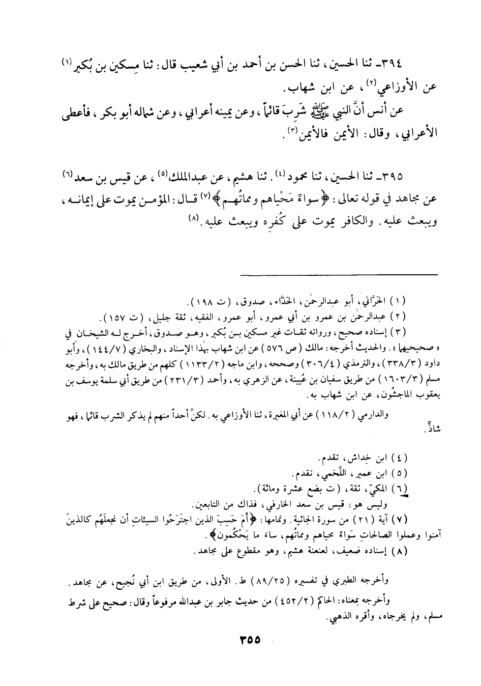 395 - ثنا الْحُسَيْنُ ثنا مَحْمُودٌ، ثنا هُشَيْمٌ، عَنْ عَبْدِ الْمَلِكِ، عَنْ قَيْسِ بْنِ سَعْدٍ، عَنْ مُجَاهِدٍ فِي قَوْلِهِ تَعَالَى: {سَوَاءً مَحْيَاهُمْ وَمَمَاتُهُمْ} [الجاثية: 21] قَالَ: «§الْمُؤْمِنُ يَمُوتُ عَلَى إِيمَانِهِ وَيُبْعَثُ عَلَيْهِ , وَالْكَافِرُ يَمُوتُ عَلَى كُفْرِهِ وَيُبْعَثُ عَلَيْهِ»