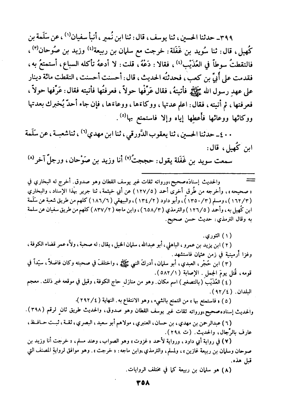 399 - حَدَّثَنَا الْحُسَيْنُ ثنا يُوسُفُ قَالَ: ثنا ابْنُ نُمَيْرٍ، أَنْبَأَ سُفْيَانُ، عَنْ سَلَمَةَ بْنِ كُهَيْلٍ قَالَ: ثنا سُوَيْدُ بْنُ غَفَلَةَ: خَرَجْتُ مَعَ سَلْمَانَ بْنِ رَبِيعَةَ وَزَيْدِ بْنِ صُوحَانَ , فَالْتَقَطْتُ سَوْطًا فِي الْعُذَيْبِ , فَقَالَا: دَعْهُ قُلْتُ: لَا أَدَعُهُ تَأْكُلُهُ السِّبَاعُ , أَسْتَمْتِعُ بِهِ , فَقَدِمْتُ عَلَى أُبَيِّ بْنِ كَعْبٍ , فَحَدَّثْتُهُ الْحَدِيثَ قَالَ: أَحْسَنْتَ أَحْسَنْتَ , الْتَقَطْتُ مِائَةَ دِينَارٍ عَلَى عَهْدِ رَسُولِ اللَّهِ صَلَّى اللهُ عَلَيْهِ وَسَلَّمَ , فَأَتَيْتُهُ , فَقَالَ: «§عَرِّفْهَا حَوْلًا» , فَعَرَّفْتُهَا فَأَتَيْتُهُ , فَقَالَ: «عَرِّفْهَا حَوْلًا» , فَعَرَّفْتُهَا , ثُمَّ أَتَيْتُهُ , فَقَالَ: «اعْلَمْ عِدَّتَهَا , وَوِكَاءَهَا , وَوِعَاءَهَا؛ فَإِنْ جَاءَ أَحَدٌ يُخْبِرُكَ بِعِدَّتِهَا وَوِكَائِهَا وَوِعَائِهَا فَأَعْطِهَا إِيَّاهُ , وَإِلَّا فَاسْتَمْتِعْ بِهَا»