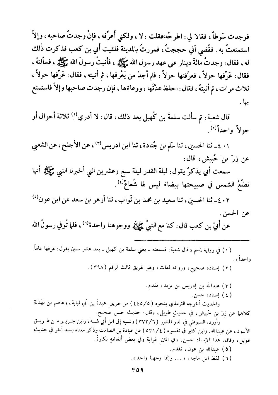 401 - ثنا الْحُسَيْنُ ثنا سَلْمُ بْنُ جُنَادَةَ، ثنا ابْنُ إِدْرِيسَ، عَنِ الْأَجْلَحِ، عَنِ الشَّعْبِيِّ، عَنْ زِرِّ بْنِ حُبَيْشٍ قَالَ: سَمِعْتُ أُبَيًّا يَذْكُرُ يَقُولُ: «§لَيْلَةُ الْقَدْرِ لَيْلَةُ سَبْعٍ وَعِشْرِينَ الَّتِي أَخْبَرَنَا النَّبِيُّ صَلَّى اللهُ عَلَيْهِ وَسَلَّمَ أَنَّهَا تَطْلُعُ الشَّمْسُ فِي صَبِيحَتِهَا بَيْضَاءَ لَيْسَ لَهَا شُعَاعٌ»