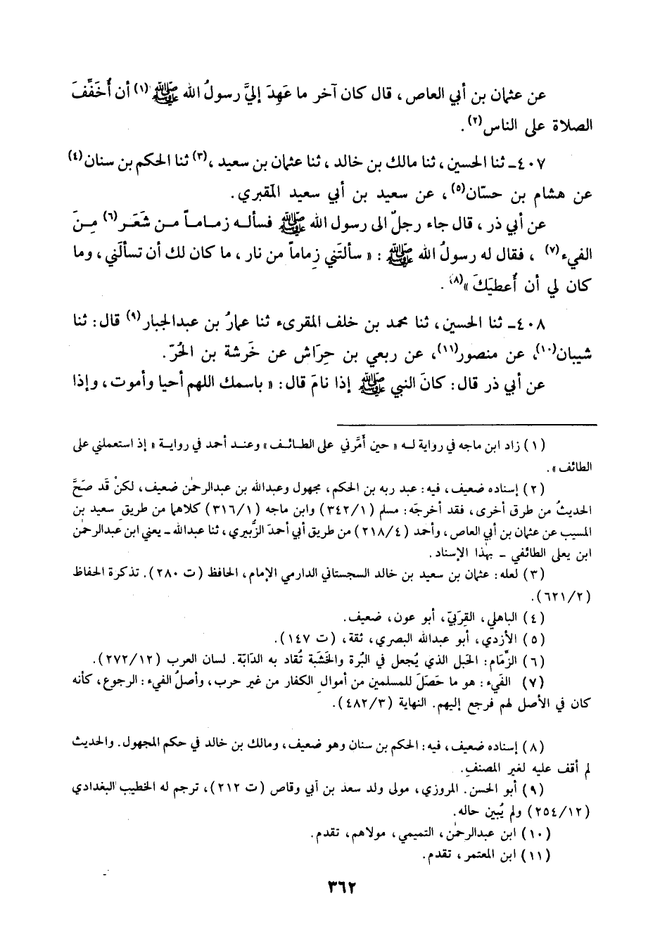 407 - ثنا الْحُسَيْنُ ثنا مَالِكُ بْنُ خَالِدٍ، ثنا عُثْمَانُ بْنُ سَعِيدٍ، ثنا الْحَكَمُ بْنُ سِنَانٍ، عَنْ هِشَامِ بْنِ حَسَّانَ، عَنْ سَعِيدِ بْنِ أَبِي سَعِيدٍ الْمَقْبُرِيِّ، عَنْ أَبِي ذَرٍّ قَالَ: جَاءَ رَجُلٌ إِلَى رَسُولِ اللَّهِ صَلَّى اللهُ عَلَيْهِ وَسَلَّمَ فَسَأَلَهُ زِمَامًا مِنْ شَعَرٍ مِنَ الْفَيْءِ , فَقَالَ لَهُ رَسُولُ اللَّهِ صَلَّى اللهُ عَلَيْهِ وَسَلَّمَ: «§سَأَلْتَنِي زِمَامًا مِنْ نَارٍ مَا كَانَ لَكَ أَنْ تَسْأَلَنِيَ , وَمَا كَانَ لِي أَنْ أُعْطِيَكَ»