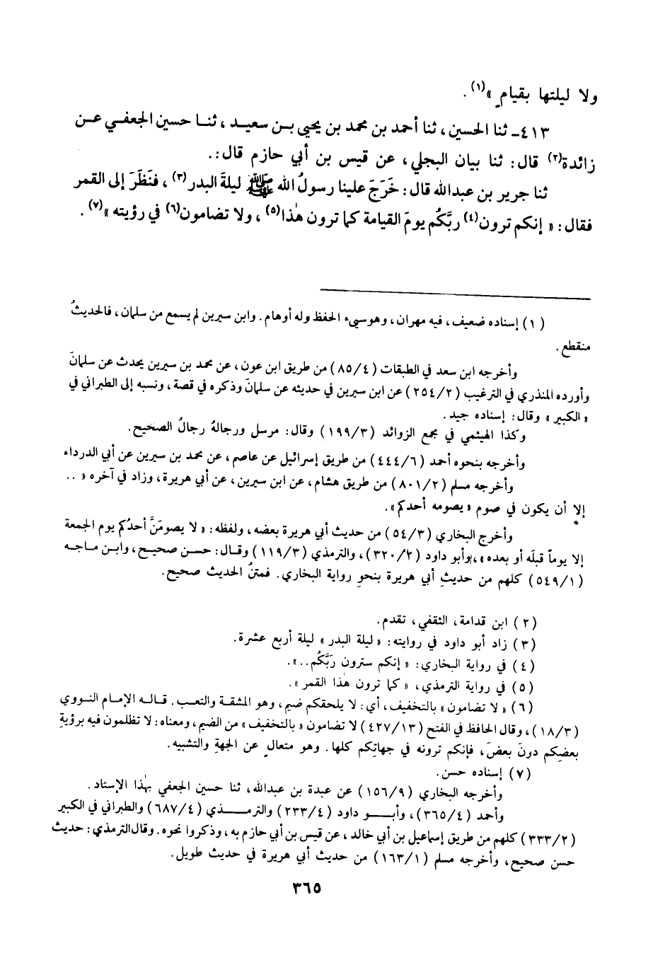 413 - ثنا الْحُسَيْنُ ثنا أَحْمَدُ بْنُ مُحَمَّدِ بْنِ يَحْيَى بْنِ سَعِيدٍ، ثنا حُسَيْنٌ الْجُعْفِيُّ، عَنْ زَائِدَةَ قَالَ: ثنا بَيَانٌ الْبَجَلِيُّ، عَنْ قَيْسِ بْنِ أَبِي حَازِمٍ قَالَ: ثنا جَرِيرُ بْنُ عَبْدِ اللَّهِ قَالَ: خَرَجَ عَلَيْنَا رَسُولُ اللَّهِ صَلَّى اللهُ عَلَيْهِ وَسَلَّمَ لَيْلَةَ الْبَدْرِ , فَنَظَرَ إِلَى الْقَمَرِ , فَقَالَ: «إِنَّكُمْ §تَرَوْنَ رَبَّكُمْ يَوْمَ الْقِيَامَةِ كَمَا تَرَوْنَ هَذَا , وَلَا تُضَامُّونَ فِي رُؤْيَتِهِ»
