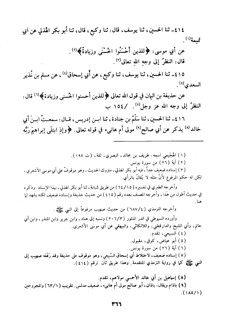 415 - ثنا الْحُسَيْنُ ثنا يُوسُفُ، ثنا وَكِيعٌ، عَنْ أَبِي إِسْحَاقَ، عَنْ مُسْلِمِ بْنِ نُذَيْرٍ السَّعْدِيِّ، عَنْ حُذَيْفَةَ بْنِ الْيَمَانِ فِي قَوْلِ اللَّهِ تَعَالَى: {لِلَّذِينَ أَحْسَنُوا الْحُسْنَى وَزِيَادَةٌ} [يونس: 26] قَالَ: «§النَّظَرُ إِلَى وَجْهِ اللَّهِ عَزَّ وَجَلَّ»