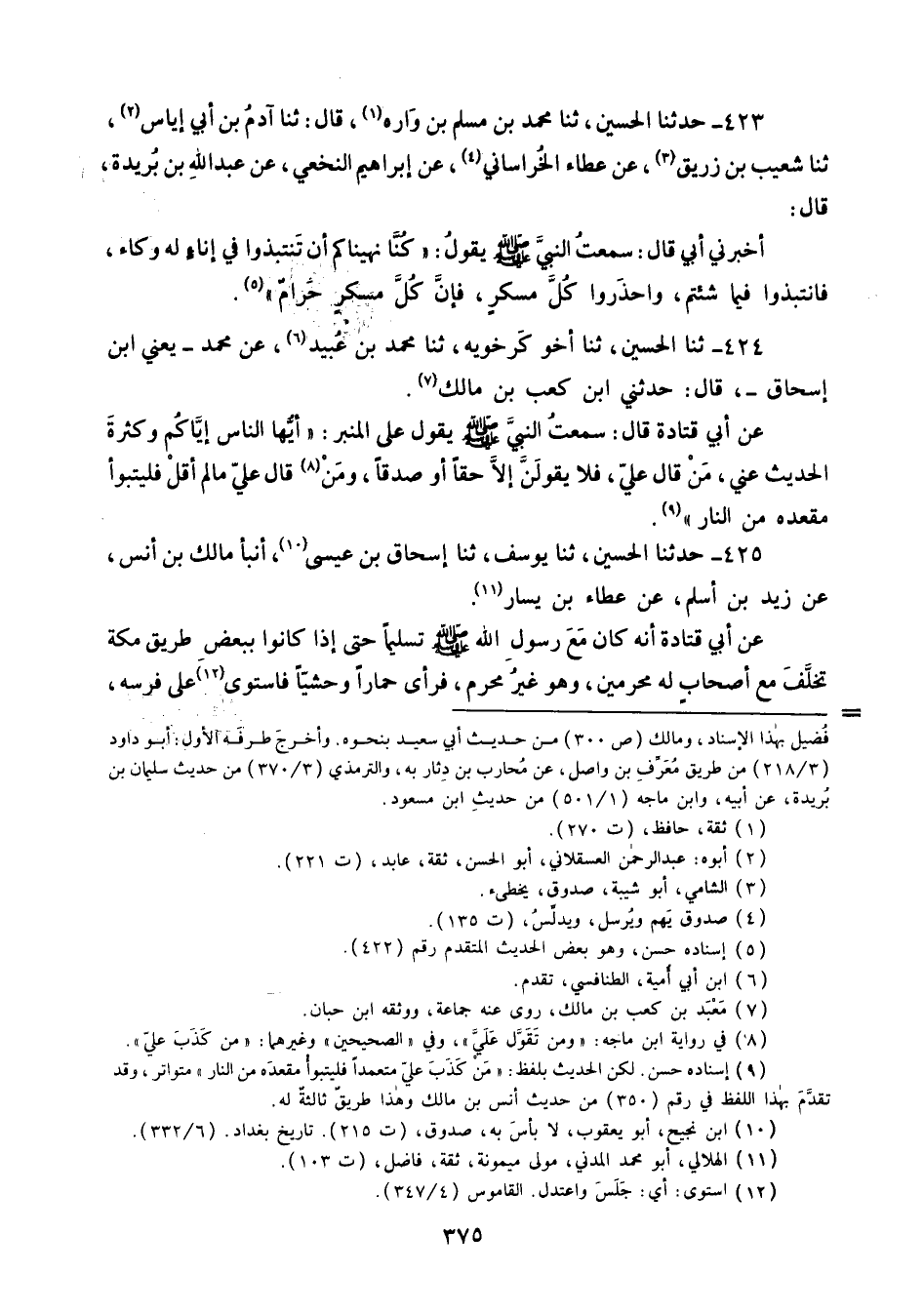 424 - ثنا الْحُسَيْنُ ثنا أَخُو كَرْخَوَيْهِ , ثنا مُحَمَّدُ بْنُ عُبَيْدٍ، عَنْ مُحَمَّدٍ يَعْنِي ابْنَ إِسْحَاقَ قَالَ: حَدَّثَنِي ابْنُ كَعْبِ بْنُ مَالِكٍ، عَنْ أَبِي قَتَادَةَ قَالَ: سَمِعْتُ النَّبِيَّ صَلَّى اللهُ عَلَيْهِ وَسَلَّمَ يَقُولُ عَلَى الْمِنْبَرِ: «أَيُّهَا النَّاسُ , §إِيَّاكُمْ وَكَثْرَةَ الْحَدِيثِ عَنِّي، مَنْ قَالَ عَلَيَّ فَلَا يَقُولَنَّ إِلَّا حَقًّا أَوْ صِدْقًا , وَمَنْ قَالَ عَلَيَّ مَا لَمْ أَقُلْ فَلْيَتَبَوَّأْ مَقْعَدَهُ مِنَ النَّارِ»