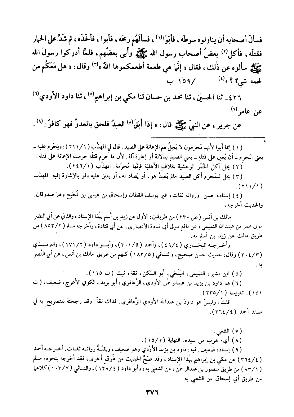 426 - ثنا الْحُسَيْنُ ثنا مُحَمَّدُ بْنُ حَسَّانَ، ثنا مَكِّيُّ بْنُ إِبْرَاهِيمَ، ثنا دَاوُدُ الْأَوْدِيُّ، عَنْ عَامِرٍ، عَنْ جَرِيرٍ، عَنِ النَّبِيِّ صَلَّى اللهُ عَلَيْهِ وَسَلَّمَ قَالَ: «§إِذْ أَبَقَ الْعَبْدُ فَلَحِقَ بِالْعَدُوِّ فَهُوَ كَافِرٌ»