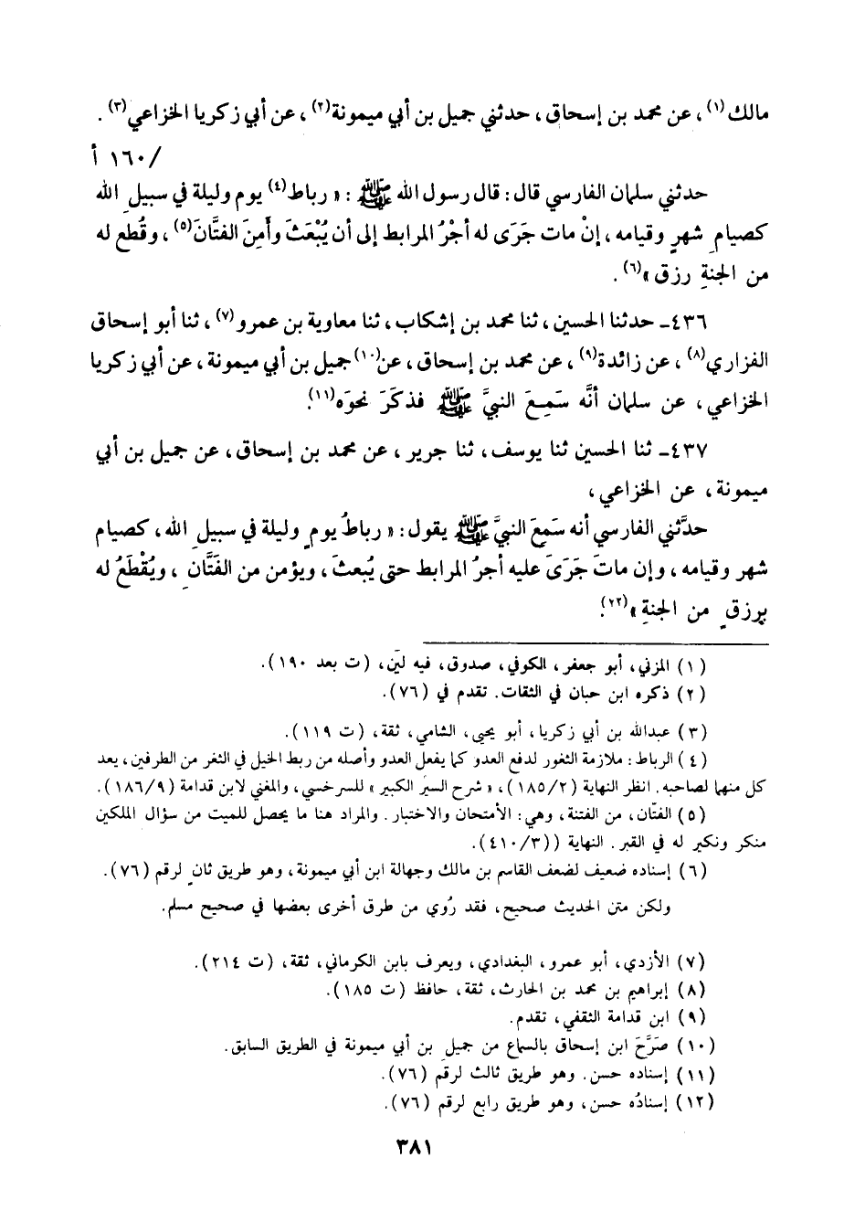 437 - ثنا الْحُسَيْنُ ثنا يُوسُفُ، ثنا جَرِيرٌ، عَنْ مُحَمَّدِ بْنِ إِسْحَاقَ، عَنْ جَمِيلِ بْنِ أَبِي مَيْمُونَةَ، عَنِ الْخُزَاعِيِّ، حَدَّثَنِي الْفَارِسِيُّ أَنَّهُ سَمِعَ النَّبِيَّ صَلَّى اللهُ عَلَيْهِ وَسَلَّمَ يَقُولُ: «§رِبَاطُ يَوْمٍ وَلَيْلَةٍ فِي سَبِيلِ اللَّهِ كَصِيَامِ شَهْرٍ وَقِيَامِهِ , وَإِنْ مَاتَ جَرَى عَلَيْهِ أَجْرُ الْمُرَابِطِ حَتَّى يُبْعَثَ , وَيُؤْمَنَ مِنَ الْفَتَّانِ , وَيُقْطَعُ لَهُ بِرِزْقٍ مِنَ الْجَنَّةِ»