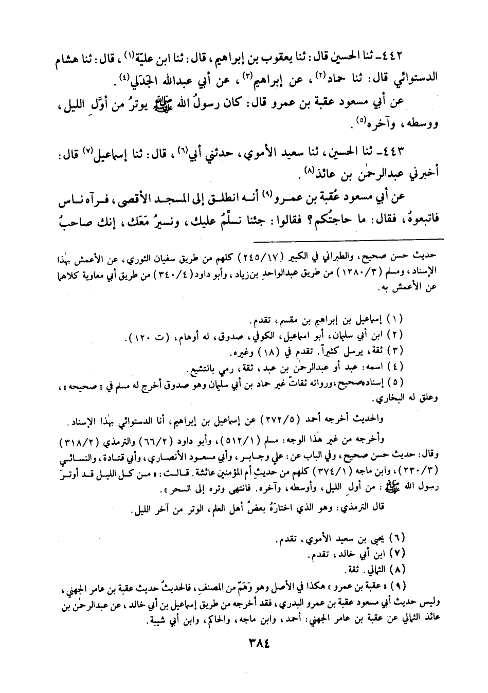443 - ثنا الْحُسَيْنُ ثنا سَعِيدُ الْأُمَوِيُّ، حَدَّثَنِي أَبِي قَالَ، ثنا إِسْمَاعِيلُ قَالَ: أَخْبَرَنِي عَبْدُ الرَّحْمَنِ بْنُ عَائِذٍ، عَنْ أَبِي مَسْعُودٍ عُقْبَةِ بْنِ عَمْرٍو أَنَّهُ انْطَلَقَ إِلَى الْمَسْجِدِ الْأَقْصَى فَرَآهُ نَاسٌ فَاتَّبِعُوهُ , فَقَالَ: مَا حَاجَتِكُمْ؟ فَقَالُوا: جِئْنَا نُسَلِّمُ عَلَيْكَ وَنَسِيرُ مَعَكَ، إِنَّكَ صَاحِبُ -[385]- رَسُولِ اللَّهِ صَلَّى اللهُ عَلَيْهِ وَسَلَّمَ قَالَ: فَقَالَ: انْزِلُوا قَالَ فَنَزَلُوا قَالَ فَلَمَّا قَضَوْا الصَّلَاةَ قَالَ: سَمِعْتُ رَسُولَ اللَّهِ صَلَّى اللهُ عَلَيْهِ وَسَلَّمَ يَقُولُ: «إِنَّهُ §لَيْسَ مِنْ عَبْدٍ يَلْقَى اللَّهَ لَا يُشْرِكُ بِهِ شَيْئًا لَمْ يَتَنَدَّ بِدَمٍ حَرَامٍ إِلَّا دَخَلَ مِنْ أَيِّ أَبْوَابِ الْجَنَّةِ شَاءَ»
