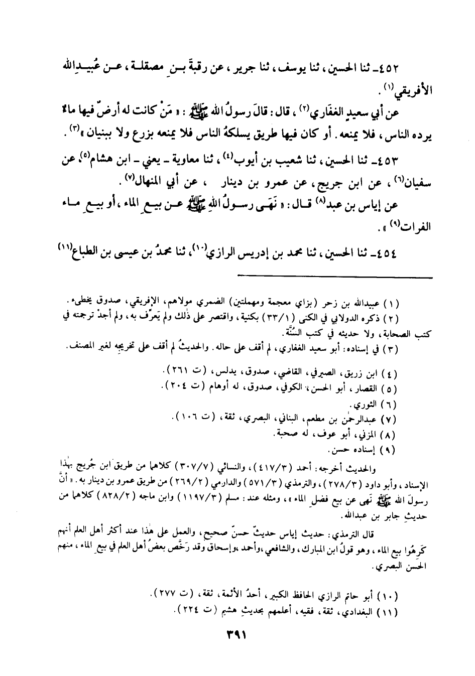 452 - ثنا الْحُسَيْنُ ثنا يُوسُفُ، ثنا جَرِيرٌ، عَنْ رَقَبَةَ بْنِ مَصْقَلَةَ، عَنْ عُبَيْدِ اللَّهِ الْإِفْرِيقِيِّ، عَنْ أَبِي سَعِيدٍ الْغِفَارِيِّ قَالَ: قَالَ رَسُولُ اللَّهِ صَلَّى اللهُ عَلَيْهِ وَسَلَّمَ: «§مَنْ كَانَتْ لَهُ أَرْضٌ فِيهَا مَاءٌ يَرِدَهُ النَّاسُ فَلَا يَمْنَعْهُ، أَوْ كَانَ فِيهَا طَرِيقٌ يَسْلُكُهُ النَّاسُ فَلَا يَمْنَعُهُ بِزَرْعٍ وَلَا بِبُنْيَانٍ»