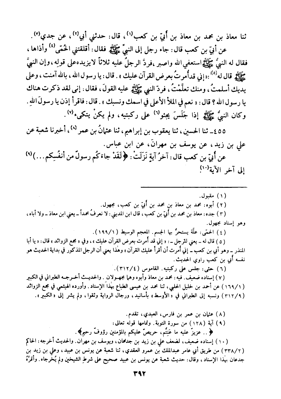 455 - ثنا الْحُسَيْنُ ثنا يَعْقُوبُ بْنُ إِبْرَاهِيمَ، ثنا عُثْمَانُ بْنُ عُمَرَ، أَخْبَرَنَا شُعْبَةُ، عَنْ عَلِيِّ بْنِ زَيْدٍ، عَنْ يُوسُفَ بْنِ مِهْرَانَ، عَنِ ابْنِ عَبَّاسٍ، عَنْ أُبَيِّ بْنِ كَعْبٍ قَالَ: " §آخِرُ أَيَّةٍ نَزَلَتْ {لَقَدْ جَاءَكُمْ رَسُولٌ مِنْ أَنْفُسِكُمْ} [التوبة: 128] إِلَى آخِرِ الْآيَةِ "