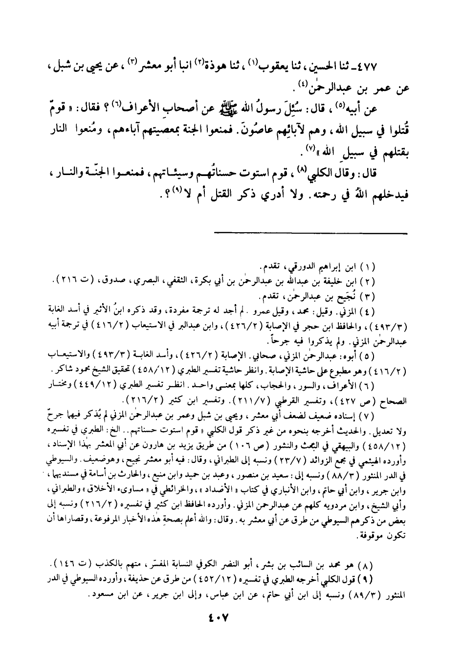 477 - ثنا الْحُسَيْنُ ثنا يَعْقُوبُ، ثنا هَوْذَةُ، أَنْبَأَ أَبُو مَعْشَرٍ، عَنْ يَحْيَى بْنِ شِبْلٍ، عَنْ عُمَرَ بْنِ عَبْدِ الرَّحْمَنِ، عَنْ أَبِيهِ قَالَ: سُئِلَ رَسُولُ اللَّهِ صَلَّى اللهُ عَلَيْهِ وَسَلَّمَ عَنْ أَصْحَابِ الْأَعْرَافِ فَقَالَ: «§قَوْمٌ قُتِلُوا فِي سَبِيلِ اللَّهِ وَهُمْ لِآبَائِهِمْ عَاصُونَ فَمُنِعُوا الْجَنَّةَ بِمَعْصِيَتِهِمْ أَبَاءَهُمْ وَمُنِعُوا النَّارَ بِقَتْلِهِمْ فِي سَبِيلِ اللَّهِ» قَالَ: وَقَالَ الْكَلْبِيُّ: قَوْمٌ اسْتَوَتْ حَسَنَاتُهُمْ وَسَيِّئَاتُهُمْ فَمُنِعُوا الْجَنَّةَ وَالنَّارَ فَيُدْخِلُهُمُ اللَّهُ فِي رَحْمَتِهِ وَلَا أَدْرِي ذَكَرَ الْقَتْلَ أَمْ لَا