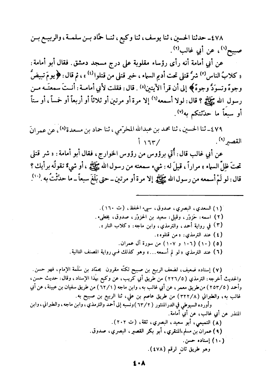 478 - ثنا الْحُسَيْنُ ثنا يُوسُفُ، ثنا وَكِيعٌ، ثنا حَمَّادُ بْنُ سَلَمَةَ، وَالرَّبِيعُ بْنُ صُبَيْحٍ، عَنْ أَبِي غَالِبٍ، عَنْ أَبِي أُمَامَةَ أَنَّهُ رَأَى رُءُوسًا مَقْلُوبَةً عَلَى دَرَجِ مَسْجِدِ دِمَشْقَ فَقَالَ أَبُو أُمَامَةَ: «§كِلَابُ النَّاسِ شَرُّ قَتْلَى تَحْتَ أَدِيمِ السَّمَاءِ، خَيْرُ قَتْلَى مَنْ قَتَلُوا»، ثُمَّ قَالَ: {يَوْمَ تَبْيَضُّ وُجُوهٌ وَتَسْوَدُّ وُجُوهٌ} [آل عمران: 106] إِلَى أَنْ قَرَأَ الْآيَتَيْنِ قَالَ: فَقُلْتُ لِأَبِي أُمَامَةَ: أَنْتَ سَمِعْتَهُ مِنْ رَسُولِ اللَّهِ صَلَّى اللهُ عَلَيْهِ وَسَلَّمَ قَالَ: لَوْلَا أَسْمَعُهُ إِلَا مَرَّةً أَوْ مَرَّتَيْنِ أَوْ ثَلَاثًا أَوْ أَرْبَعًا أَوْ خَمْسًا أَوْ سِتًّا أَوْ سَبْعًا مَا حَدَّثْتُكُمْ بِهِ "