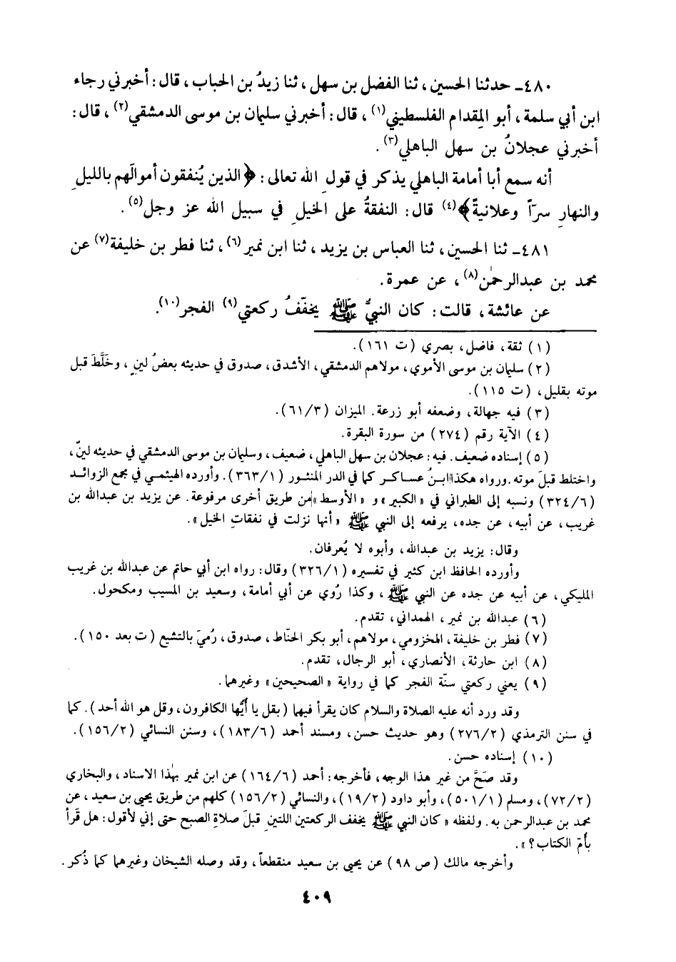 481 - ثنا الْحُسَيْنُ ثنا الْعَبَّاسِيُّ بْنُ يَزِيدَ، ثنا ابْنُ نُمَيْرٍ، ثنا فِطْرُ بْنُ خَلِيفَةَ، عَنْ مُحَمَّدِ بْنِ عَبْدِ الرَّحْمَنِ، عَنْ عَمْرَةَ، عَنْ عَائِشَةَ قَالَتْ: «كَانَ النَّبِيُّ صَلَّى اللهُ عَلَيْهِ وَسَلَّمَ §يُخَفِّفُ رَكْعَتَيِ الْفَجْرِ»
