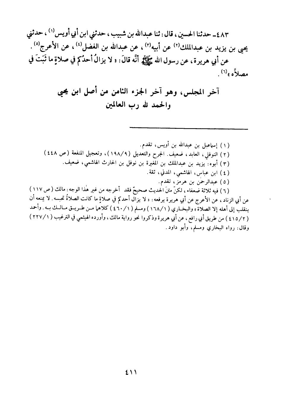 483 - حَدَّثَنَا الْحُسَيْنُ ثنا عَبْدُ اللَّهِ بْنُ شَبِيبٍ، حَدَّثَنِي ابْنُ أَبِي أُوَيْسٍ، حَدَّثَنِي يَحْيَى بْنُ يَزِيدَ بْنِ عَبْدِ الْمَلِكِ، عَنْ أَبِيهِ، عَنْ عَبْدِ اللَّهِ بْنِ الْفَضْلِ، عَنِ الْأَعْرَجِ، عَنْ أَبِي هُرَيْرَةَ عَنْ رَسُولِ اللَّهِ صَلَّى اللهُ عَلَيْهِ وَسَلَّمَ أَنَّهُ قَالَ: «§لَا يَزَالُ أَحَدُكُمْ فِي صَلَاةٍ مَا ثَبَتَ فِي مُصَلَّاهُ»