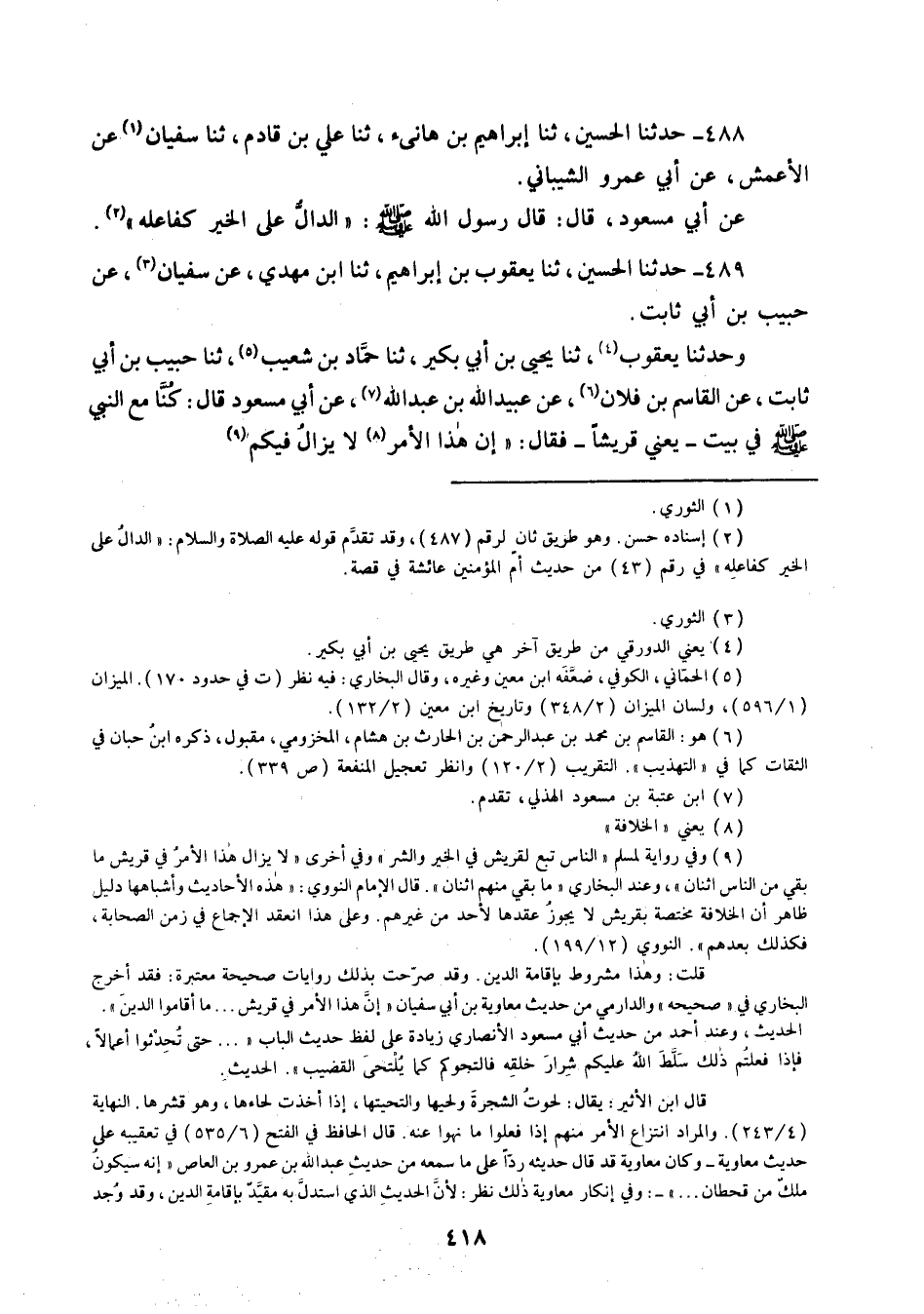 488 - حَدَّثَنَا الْحُسَيْنُ ثنا إِبْرَاهِيمُ بْنُ هَانِئٍ، ثنا عَلِيُّ بْنُ قَادِمٍ، ثنا سُفْيَانُ، عَنِ الْأَعْمَشِ، عَنْ أَبِي عَمْرٍو الشَّيْبَانِيِّ، عَنْ أَبِي مَسْعُودٍ قَالَ: قَالَ رَسُولُ اللَّهِ صَلَّى اللهُ عَلَيْهِ وَسَلَّمَ: «§الدَّالُّ عَلَى الْخَيْرِ كَفَاعِلِهِ»