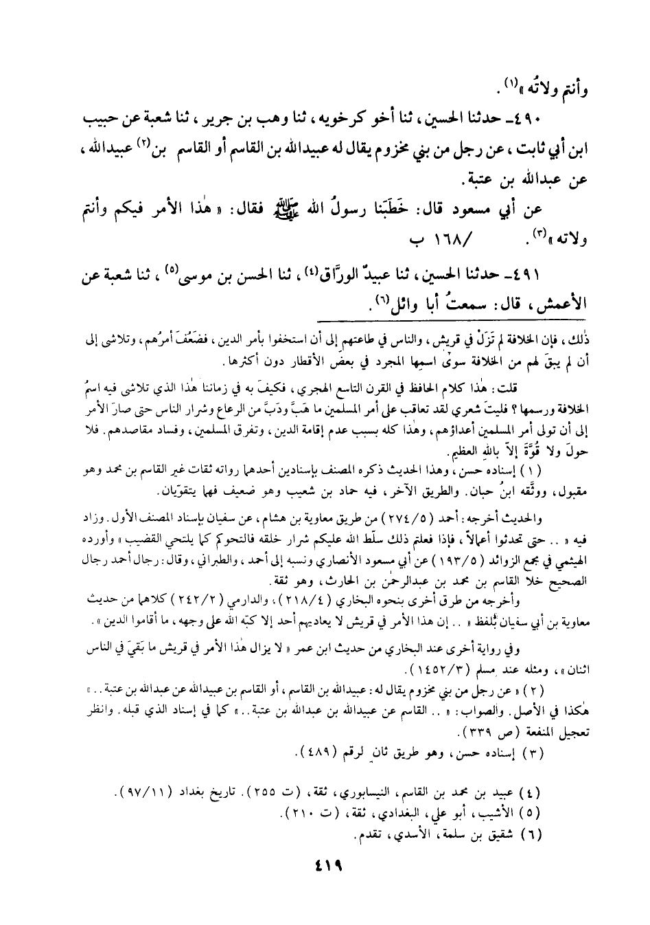 490 - حَدَّثَنَا الْحُسَيْنُ ثنا أَخُو كَرْخَوَيْهِ، ثنا وَهْبُ بْنُ جَرِيرٍ، ثنا شُعْبَةُ، عَنْ حَبِيبِ بْنِ أَبِي ثَابِتٍ، عَنْ رَجُلٍ مِنْ بَنِي مَخْزُومٍ يُقَالُ لَهُ عُبَيْدُ اللَّهِ بْنُ الْقَاسِمِ أَوِ الْقَاسِمُ بْنُ عُبَيْدِ اللَّهِ، عَنْ عَبْدِ اللَّهِ بْنِ عُتْبَةَ، عَنْ أَبِي مَسْعُودٍ قَالَ: خَطَبَنَا رَسُولُ اللَّهِ صَلَّى اللهُ عَلَيْهِ وَسَلَّمَ فَقَالَ: «§هَذَا الْأَمْرُ فِيكُمْ وَأَنْتُمْ وُلَاتُهُ»