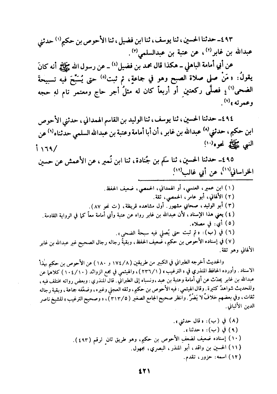 493 - حَدَّثَنَا الْحُسَيْنُ ثنا يُوسُفُ، ثنا ابْنُ فُضَيْلٍ، ثنا الْأَحْوَصُ بْنُ حَكِيمٍ، حَدَّثَنِي عَبْدُ اللَّهِ بْنُ غَابِرٍ، عَنْ عُتْبَةَ بْنِ عَبْدٍ السُّلَمِيِّ، عَنْ أَبِي أُمَامَةَ الْبَاهِلِيِّ، هَكَذَا قَالَ مُحَمَّدُ بْنُ فُضَيْلٍ عَنْ رَسُولِ اللَّهِ صَلَّى اللهُ عَلَيْهِ وَسَلَّمَ: إِنَّهُ كَانَ يَقُولُ: «§مَنْ صَلَّى صَلَاةَ الصُّبْحِ وَهُوَ فِي جَمَاعَةٍ ثُمَّ ثَبَتَ حَتَّى يُسَبِّحَ فِيهِ تَسْبِيحَةَ الضُّحَى فَصَلَّى رَكْعَتَيْنِ أَوْ أَرْبَعًا كَانَ لَهُ مِثْلُ أَجْرِ حَاجٍّ وَمُعْتَمِرٍ تَامٍّ لَهُ حَجُّهُ وَعُمْرَتُهُ»