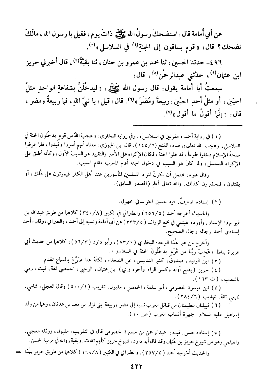 496 - حَدَّثَنَا الْحُسَيْنُ ثنا مُحَمَّدُ بْنُ عَمْرِو بْنِ حَنَانٍ، ثنا بَقِيَّةُ قَالَ: أَخْبَرَنِي حَرِيزُ بْنُ عُثْمَانَ، حَدَّثَنِي عَبْدُ الرَّحْمَنِ قَالَ: سَمِعْتُ أَبَا أُمَامَةَ يَقُولُ: قَالَ رَسُولُ اللَّهِ صَلَّى اللهُ عَلَيْهِ وَسَلَّمَ: «§لَيَدْخُلَنَّ بِشَفَاعَةِ الْوَاحِدِ مِثْلُ الْحَيَّيْنِ أَوْ مِثْلُ أَحَدِ الْحَيَّيْنِ رَبِيعَةَ وَمُضَرَ» قَالَ: قِيلَ يَا نَبِيَّ اللَّهِ فَمَا رَبِيعَةُ وَمُضَرُ قَالَ: «إِنَّمَا أَقُولُ مَا أَقُولُ»