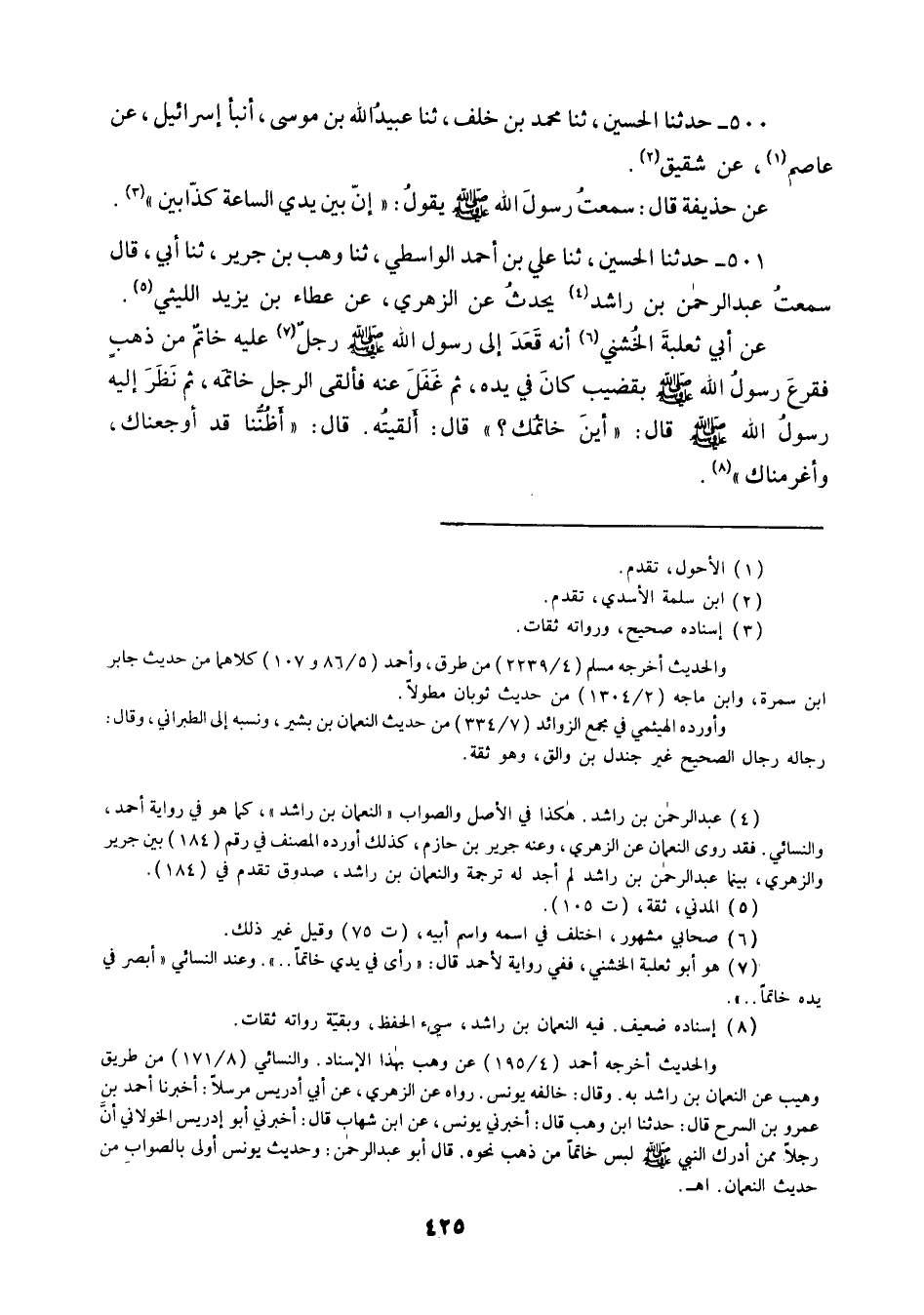 501 - حَدَّثَنَا الْحُسَيْنُ ثنا عَلِيُّ بْنُ أَحْمَدَ الْوَاسِطِيُّ، ثنا وَهْبُ بْنُ جَرِيرٍ، ثنا أَبِي قَالَ: سَمِعْتُ عَبْدَ الرَّحْمَنِ بْنَ رَاشِدٍ، يُحَدِّثُ عَنِ الزُّهْرِيِّ، عَنْ عَطَاءِ بْنِ يَزِيدَ اللَّيْثِيِّ، عَنْ أَبِي ثَعْلَبَةَ الْخُشَنِيَّ، أَنَّهُ قَعَدَ إِلَى رَسُولِ اللَّهِ صَلَّى اللهُ عَلَيْهِ وَسَلَّمَ رَجُلٌ عَلَيْهِ خَاتَمٌ مِنْ ذَهَبٍ " فَقَرَعَ رَسُولُ اللَّهِ صَلَّى اللهُ عَلَيْهِ وَسَلَّمَ بِقَضِيبٍ كَانَ فِي يَدَهُ ثُمَّ غَفَلَ عَنْهُ فَأَلْقَى الرَّجُلُ خَاتَمَهُ ثُمَّ نَظَرَ إِلَيْهِ رَسُولُ اللَّهِ صَلَّى اللهُ عَلَيْهِ وَسَلَّمَ قَالَ: «§أَيْنَ خَاتَمُكَ» قَالَ؟: أَلْقَيْتُهُ قَالَ: «أَظُنُّنَا قَدْ أَوْجَعْنَاكَ وَأَغْرَمْنَاكَ»