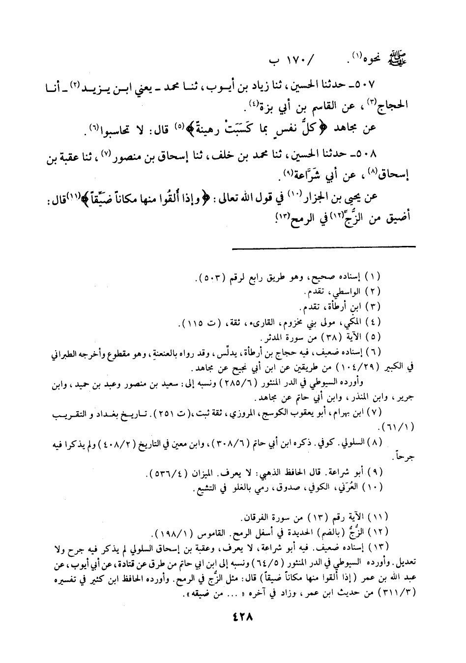 507 - حَدَّثَنَا الْحُسَيْنُ ثنا زِيَادُ بْنُ أَيُّوبَ، ثنا مُحَمَّدُ يَعْنِي ابْنَ يَزِيدَ، أنا الْحَجَّاجُ، عَنِ الْقَاسِمِ بْنِ أَبِي بَزَّةَ، عَنْ مُجَاهِدٍ: {§كُلُّ نَفْسٍ بِمَا كَسَبَتْ رَهِينَةٌ} [المدثر: 38] قَالَ: «لَا تُحَاسَبُوا»