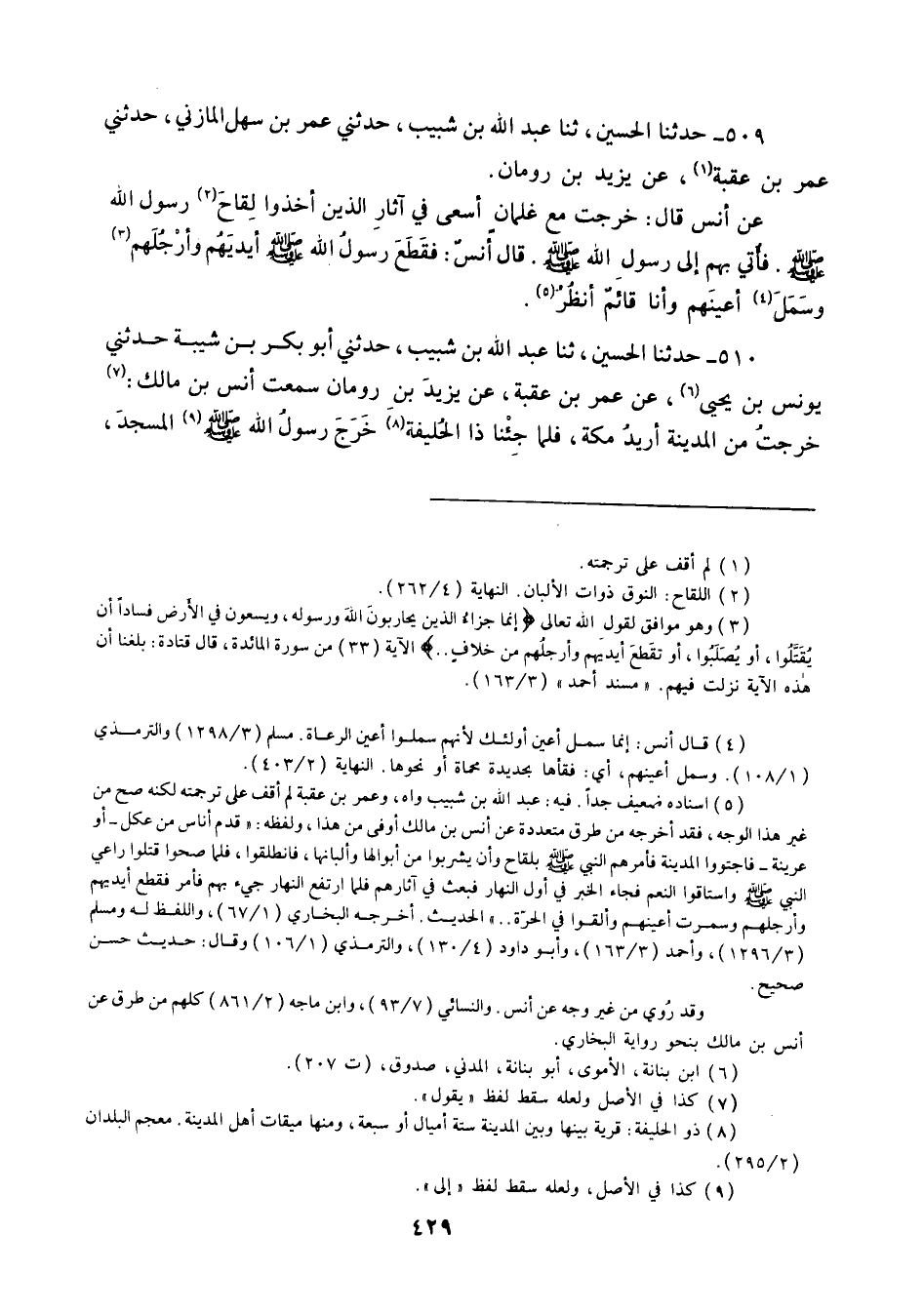 509 - حَدَّثَنَا الْحُسَيْنُ ثنا عَبْدُ اللَّهِ بْنُ شَبِيبٍ، حَدَّثَنِي عُمَرُ بْنُ سَهْلٍ الْمَازِنِيُّ، حَدَّثَنِي عُمَرُ بْنُ عُقْبَةَ، عَنْ يَزِيدَ بْنِ رُومَانَ، عَنْ أَنَسٍ قَالَ: خَرَجْتُ مَعَ غِلْمَانٍ أَسْعَى فِي آثَارِ الَّذِينَ أَخَذُوا لِقَاحَ رَسُولِ اللَّهِ صَلَّى اللهُ عَلَيْهِ وَسَلَّمَ فَأُتِيَ بِهِمْ إِلَى رَسُولِ اللَّهِ صَلَّى اللهُ عَلَيْهِ وَسَلَّمَ قَالَ أَنَسٌ: «§فَقَطَعَ رَسُولُ اللَّهِ صَلَّى اللهُ عَلَيْهِ وَسَلَّمَ أَيْدِيَهِمْ وَأَرْجُلَهُمْ وَسَمَلَ أَعْيُنَهُمْ وَأَنَا قَائِمٌ أَنْظُرْ»