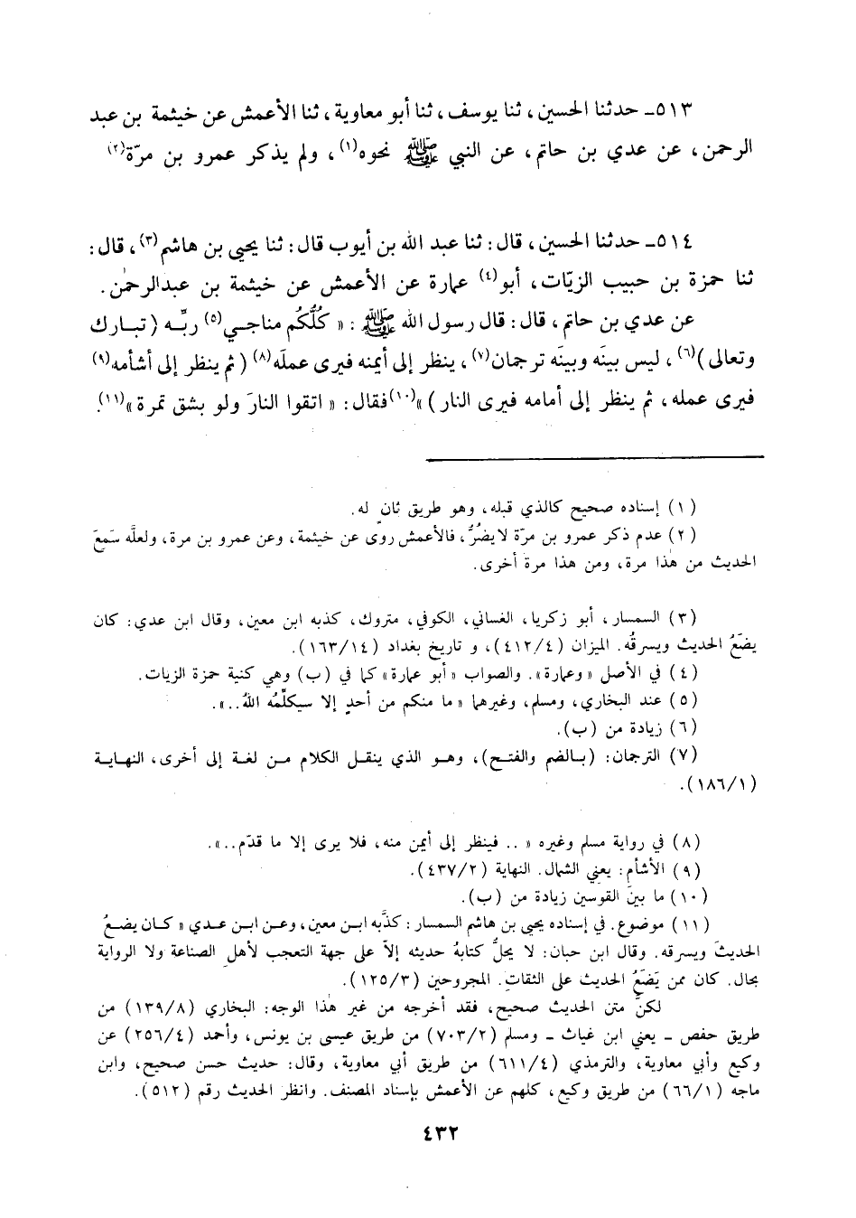 514 - حَدَّثَنَا الْحُسَيْنُ ثنا عَبْدُ اللَّهِ بْنُ أَيُّوبَ قَالَ: ثنا يَحْيَى بْنُ هَاشِمٍ قَالَ: ثنا حَمْزَةُ بْنُ حَبِيبٍ الزَّيَّاتُ أَبُو عُمَارَةَ، عَنِ الْأَعْمَشِ، عَنْ خَيْثَمَةَ بْنِ عَبْدِ الرَّحْمَنِ، عَنْ عَدِيِّ بْنِ حَاتِمٍ قَالَ: قَالَ رَسُولُ اللَّهِ صَلَّى اللهُ عَلَيْهِ وَسَلَّمَ: " §كُلُّكُمْ مُنَاجِي رَبِّهِ تَبَارَكَ وَتَعَالَى لَيْسَ بَيْنَهُ وَبَيْنَهُ تُرْجُمَانٌ يَنْظُرُ إِلَى أَيْمَنِهِ فَيَرَى عَمَلَهُ ثُمَّ يَنْظُرُ إِلَى أَشْأَمِهِ فَيَرَى عَمَلَهُ ثُمَّ يَنْظُرُ إِلَى أَمَامِهِ فَيَرَى النَّارَ فَقَالَ: اتَّقُوا النَّارَ وَلَوْ بِشِقِّ تَمْرَةٍ "