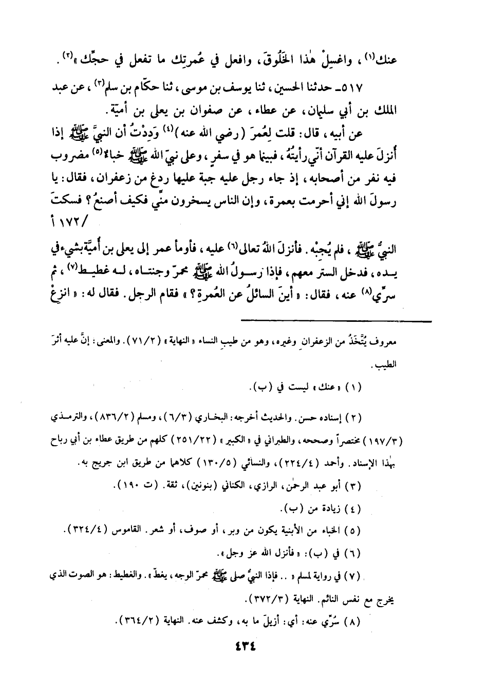 517 - حَدَّثَنَا الْحُسَيْنُ ثنا يُوسُفُ بْنُ مُوسَى، ثنا حَكَّامُ بْنُ سَلْمٍ، عَنْ عَبْدِ الْمَلِكِ بْنِ أَبِي سُلَيْمَانَ، عَنْ عَطَاءٍ، عَنْ صَفْوَانَ بْنِ يَعْلَى بْنِ أُمَيَّةَ، عَنْ أَبِيهِ قَالَ: قُلْتُ لِعُمَرَ رَضِيَ اللَّهُ عَنْهُ: وَدِدْتُ أَنَّ النَّبِيَّ صَلَّى اللهُ عَلَيْهِ وَسَلَّمَ إِذَا أُنْزِلَ عَلَيْهِ الْقُرْآنُ أَنِّي رَأَيْتُهُ فَبَيْنَمَا هُوَ فِي سَفَرٍ وَعَلَى نَبِيِّ اللَّهِ صَلَّى اللهُ عَلَيْهِ وَسَلَّمَ خِبَاءٌ مَضْرُوبٌ فِيهِ نَفَرٌ مِنْ أَصْحَابِهِ إِذْ جَاءَ رَجُلٌ عَلَيْهِ جُبَّةٌ عَلَيْهَا رَدْغٌ مِنْ زَعْفَرَانَ فَقَالَ: يَا رَسُولَ اللَّهِ إِنِّي أَحْرَمْتُ بِعُمْرَةٍ وَإِنَّ النَّاسَ يَسْخَرُونَ مِنِّي، فَكَيْفَ " أَصْنَعُ فَسَكَتَ النَّبِيُّ صَلَّى اللهُ عَلَيْهِ وَسَلَّمَ فَلَمْ يُجِبْهُ، فَأَنْزَلَ اللَّهُ تَعَالَى عَلَيْهِ فَأَوْمَأَ عُمَرُ إِلَى يَعْلَى بْنِ أُمَيَّةَ بِشَيْءٍ فِي يَدِهِ فَدَخَلَ السِّتْرَ مَعَهُمْ فَإِذَا رَسُولُ اللَّهِ صَلَّى اللهُ عَلَيْهِ وَسَلَّمَ مُحْمَرٌّ وَجْنَتَاهُ لَهُ غَطِيطٌ ثُمَّ سُرِّيَ عَنْهُ فَقَالَ: «§أَيْنَ السَّائِلُ عَنِ الْعُمْرَةِ؟» فَقَامَ الرَّجُلُ فَقَالَ لَهُ: «انْزِعْ -[435]- جُبَّتَكَ هَذِهِ عَنْكَ وَمَا كُنْتَ صَانِعًا فِي حَجِّكَ فَاصْنَعْهُ فِي عُمْرَتِكَ»
