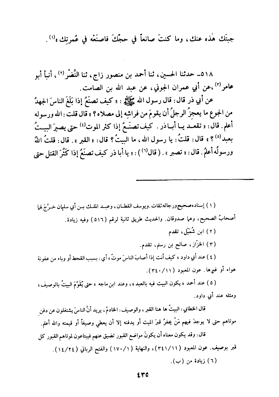 518 - حَدَّثَنَا الْحُسَيْنُ ثنا أَحْمَدُ بْنُ مَنْصُورٍ زَاجٌ، ثنا النَّضْرٌ، أَنْبَأَ أَبُو عَامِرٍ، عَنْ أَبِي عِمْرَانَ الْجَوْنِيِّ، عَنْ عَبْدِ اللَّهِ بْنِ الصَّامِتِ، عَنْ أَبِي ذَرٍّ قَالَ: قَالَ رَسُولُ اللَّهِ صَلَّى اللهُ عَلَيْهِ وَسَلَّمَ: «§كَيْفَ تَصْنَعُ إِذَا بَلَغَ النَّاسَ الْجَهْدُ مِنَ الْجُوعِ مَا يَعْجِزُ الرَّجُلُ أَنْ يَقُومَ مِنْ فِرَاشِهِ إِلَى مُصَلَّاهُ» قَالَ: قُلْتُ: اللَّهُ وَرَسُولُهُ أَعْلَمُ قَالَ: «تَقْعُدُ يَا أَبَا ذَرٍّ كَيْفَ تَصْنَعُ إِذَا كَثُرَ الْمَوْتُ حَتَّى يَصِيرَ الْبَيْتُ بِعَبْدٍ؟» قَالَ: قُلْتُ يَا رَسُولَ اللهِ: مَا الْبَيْتُ؟ قَالَ: «الْقَبْرُ» قَالَ: قُلْتُ اللَّهُ وَرَسُولُهُ أَعْلَمُ قَالَ: «تَصْبِرُ» قَالَ: «يَا أَبَا ذَرِّ كَيْفَ تَصْنَعُ إِذَا كَثُرَ الْقَتْلُ حَتَّى -[436]- تَغْرِقَ حِجَارَةُ الزَّيْتِ بِالدِّمَاءِ؟» قَالَ: قُلْتُ اللَّهُ وَرَسُولُهُ اعْلَمْ قَالَ: «تَلْحَقُ بِمَنْ أَنْتَ» قَالَ: قُلْتُ: أَفَلَا أَحْمِلُ سِلَاحِي قَالَ: «شَارَكْتَ الْقَوْمَ إِذًا، لَا وَلَكِنْ إِنْ خِفْتَ أَنْ يَقْهَرَكَ شُعَاعٌ فَخُذْ نَاحِيَةً ثَوْبَكَ فَأَلْقِهِ يَبُوءُ بِاثْمِكَ وَإِثْمِهِ»