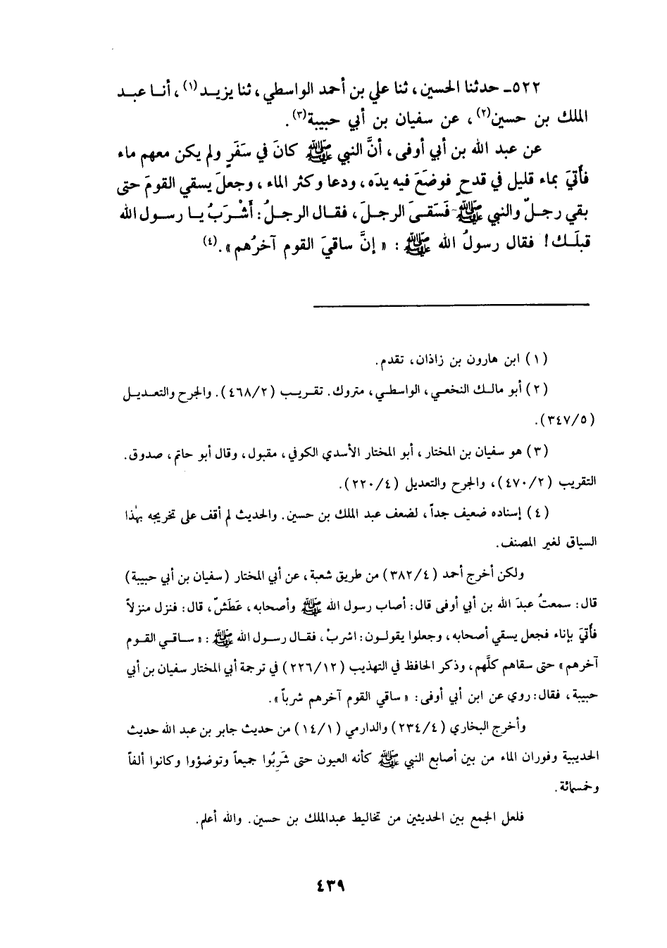 522 - حَدَّثَنَا الْحُسَيْنُ ثنا عَلِيُّ بْنُ أَحْمَدَ الْوَاسِطِيُّ، ثنا يَزِيدُ، أنا عَبْدُ الْمَلِكِ بْنُ حُسَيْنٍ، عَنْ سُفْيَانَ بْنِ أَبِي حَبِيبَةَ، عَنْ عَبْدِ اللَّهِ بْنِ أَبِي أَوْفَى أَنَّ النَّبِيَّ صَلَّى اللهُ عَلَيْهِ وَسَلَّمَ: " كَانَ فِي سَفَرٍ وَلَمْ يَكُنْ مَعَهُمْ مَاءٌ فَأُتِيَ بِمَاءٍ قَلِيلٍ فِي قَدَحٍ فَوَضَعَ فِيهِ يَدَهُ وَدَعَا وَكَثُرَ الْمَاءُ وَجَعَلَ يَسْقِي الْقَوْمَ حَتَّى بَقِيَ رَجُلٌ وَالنَّبِيُّ صَلَّى اللهُ عَلَيْهِ وَسَلَّمَ فَسَقَى الرَّجُلَ فَقَالَ الرَّجُلُ أَشْرَبُ يَا رَسُولَ اللَّهِ قَبْلَكَ؟ فَقَالَ رَسُولُ اللَّهِ صَلَّى اللهُ عَلَيْهِ وَسَلَّمَ: «إِنَّ §سَاقِيَ الْقَوْمِ آخِرُهُمْ»