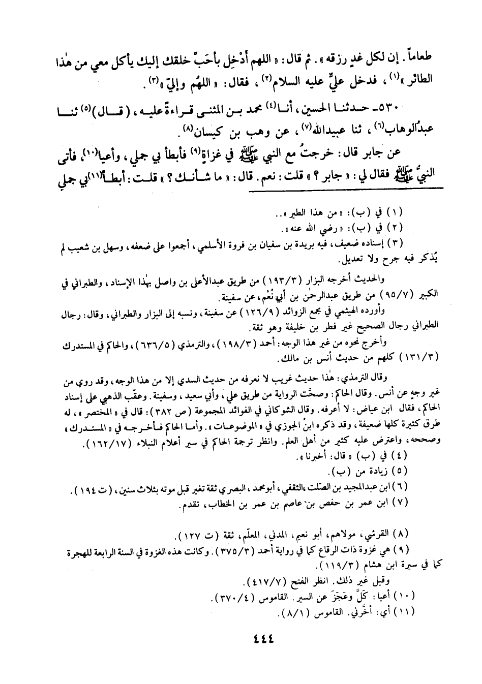 530 - حَدَّثَنَا الْحُسَيْنُ أَنَا مُحَمَّدُ بْنُ الْمُثَنَّى قِرَاءَةً عَلَيْهِ قَالَ: ثنا عَبْدُ الْوَهَّابِ، ثنا عُبَيْدُ اللَّهِ، عَنْ وَهْبِ بْنِ كَيْسَانَ، عَنْ جَابِرٍ قَالَ: خَرَجْتُ مَعَ النَّبِيِّ صَلَّى اللهُ عَلَيْهِ وَسَلَّمَ فِي غَزَاةٍ فَأَبْطَأَ بِي جَمَلِي وَأَعْيَا فَأَتَى النَّبِيُّ صَلَّى اللهُ عَلَيْهِ وَسَلَّمَ فَقَالَ لِي: " جَابِرُ، قُلْتُ: نَعَمْ قَالَ: «§مَا شَأْنُكَ؟» قُلْتُ أَبْطَأَ بِيَ جَمَلِي -[445]-، وَأَعْيَا فَتَخَلَّفَ فَنَزَلَ فَحَجَنَهُ بِمِحْجَنِهِ ثُمَّ قَالَ: «ارْكَبْ» فَرَكِبْتُ فَلَقَدْ رَأَيْتُنِي أَكُفُّهُ عَنِ النَّبِيِّ صَلَّى اللهُ عَلَيْهِ وَسَلَّمَ قَالَ: «أَتَزَوَّجْتَ؟» قُلْتُ: نَعَمْ قَالَ: «أَبِكْرًا أَمْ ثَيِّبًا؟» فَقُلْتُ: بَلْ ثَيِّبٌ فَقَالَ: «فَهَلَّا جَارِيَةً تُلَاعِبُهَا وَتُلَاعِبُكَ؟» قُلْتُ: إِنَّ لِيَ أَخَوَاتٍ فَأَحْبَبْتُ أَنَّ أَتَزَوَّجَ امْرَأَةً تَجْمَعُهُنَّ وَتَمَشِّطُهُنَّ وَتَقُومُ عَلَيْهِنَّ قَالَ: «أَمَا إِنَّكَ قَادِمٌ فَإِذَا قَدِمْتَ فَالْكَيْسَ الْكَيْسَ» ثُمَّ قَالَ: «أَتَبِيعُ جَمَلَكَ؟» قُلْتُ: نَعَمْ فَاشْتَرَاهُ مِنِّي بِأُوقِيَّةٍ ثُمَّ قَدِمَ النَّبِيَّ صَلَّى اللهُ عَلَيْهِ وَسَلَّمَ قَبْلِي وَقَدِمْتُ بِالْغَدَاةِ فَجِئْتُ الْمَسْجِدَ فَوَجَدْتُهُ عَلَى بَابِ الْمَسْجِدِ قَالَ: " الْآنَ حِينَ قَدِمْتَ قُلْتُ: نَعَمْ، قَالَ: «دَعْ جَمَلَكَ وَادْخُلْ فَصَلِّ رَكْعَتَيْنِ» قَالَ: فَدَخَلْتُ فَصَلَّيْتُ رَكْعَتَيْنِ ثُمَّ رَجَعْتُ فَأَمَرَ بِلَالًا أَنْ يَزِنَ لِي أُوقِيَّةً فَوَزَنَ لِي بِلَالٌ فَأَرْجَحَ فِي الْمِيزَانِ قَالَ: فَانْطَلَقْتُ فَلَمَّا وَلَّيْتُ قَالَ: «ادْعُ لِي جَابِرًا» فَدُعِيتُ فَقُلْتُ: الْآنَ يَرُدُّ عَلِيَّ الْجَمَلَ وَلَمْ يَكُنْ شَيْءٌ أَبْغَضُ إِلِيَّ مِنْهُ فَقَالَ: «خُذْ جَمَلَكَ وَلَكَ ثَمَنَهُ»