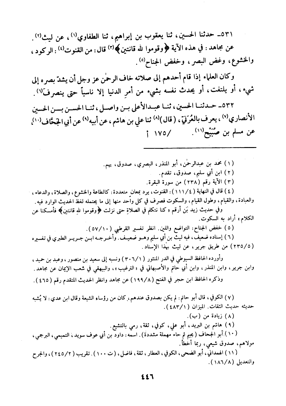 531 - حَدَّثَنَا الْحُسَيْنُ ثنا يَعْقُوبُ بْنُ إِبْرَاهِيمَ، ثنا الطُّفَاوِيُّ، عَنْ لَيْثٍ، عَنْ مُجَاهِدٍ فِي هَذِهِ الْآيَةِ: {§وَقُومُوا لِلَّهِ قَانِتِينَ} [البقرة: 238] قَالَ: «مِنَ الْقُنُوتِ الرُّكُودُ وَالْخُشُوعُ وَغَضُّ الْبَصَرِ وَخَفَضُ الْجَنَاحِ وَكَانَ الْعُلَمَاءُ إِذَا قَامَ أَحَدُهُمْ إِلَى صَلَاتِهِ خَافَ الرَّحْمَنَ عَزَّ وَجَلَّ أَنْ يَشُدَّ بَصَرَهُ إِلَى شَيْءٍ أَوْ يَلْتَفِتُ أَوْ يُحَدِّثُ نَفْسَهُ بِشَيْءٍ مِنْ أَمَرِ الدُّنْيَا إِلَا نَاسِيًا حَتَّى يَنْصَرِفَ»
