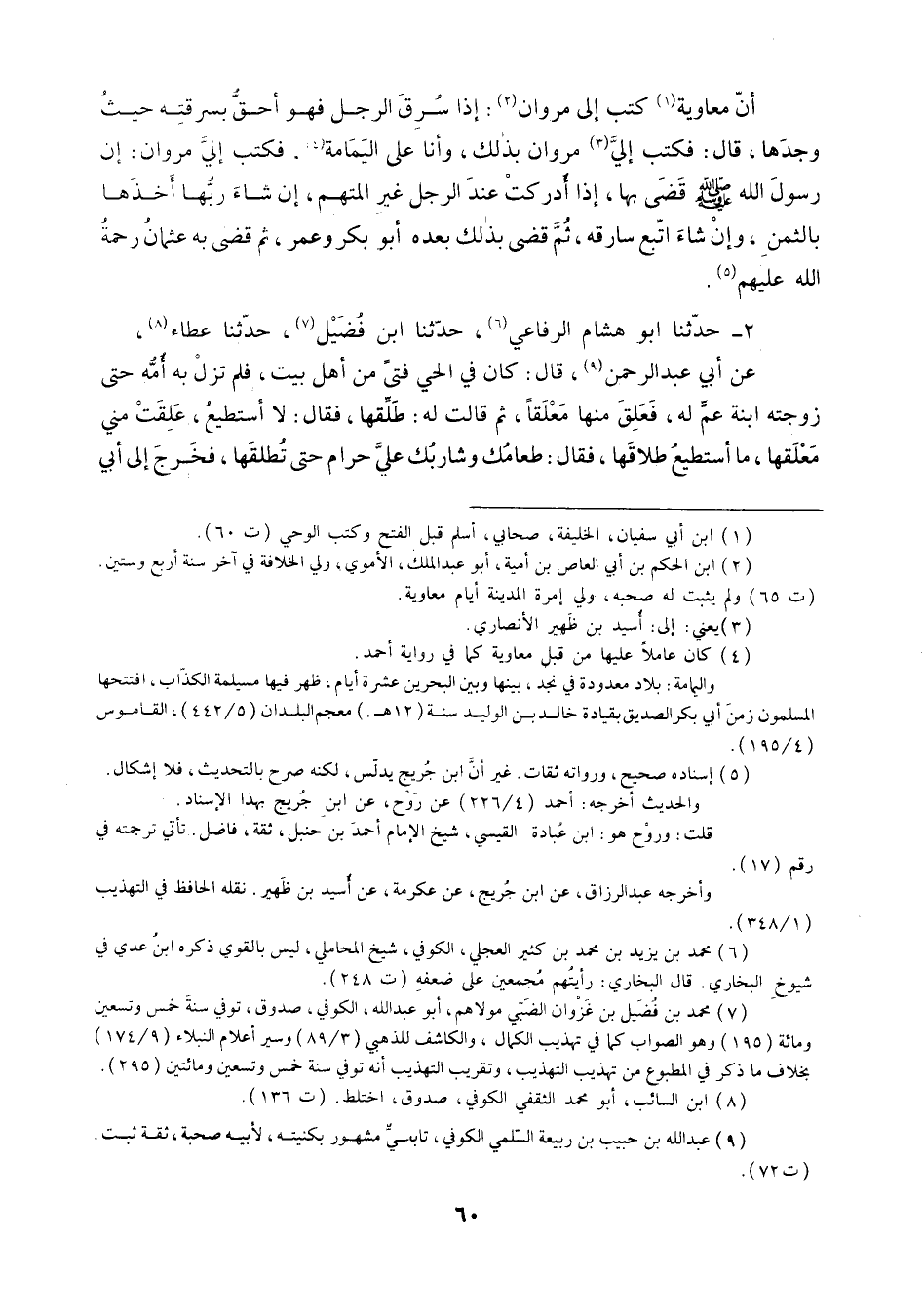 2 - حَدَّثَنَا أَبُو هِشَامٍ الرِّفَاعِيُّ، حَدَّثَنَا ابْنُ فُضَيْلٍ، حَدَّثَنَا عَطَاءٌ، عَنْ أَبِي عَبْدِ الرَّحْمَنِ قَالَ: كَانَ فِي الْحَيِّ فَتًى مِنْ أَهْلِ بَيْتٍ , فَلَمْ تَزَلْ بِهِ أُمُّهُ حَتَّى زَوَّجَتْهُ ابْنَةَ عَمٍّ لَهُ , فَعَلِقَ مِنْهَا مَعْلَقًا , ثُمَّ قَالَتْ لَهُ: طَلِّقْهَا , فَقَالَ: لَا أَسْتَطِيعُ؛ عَلِقَتْ مِنِّي مَعْلَقَهَا مَا أَسْتَطِيعُ طَلَاقَهَا , فَقَالَتْ: طَعَامُكَ , وَشَرَابُكَ عَلَيَّ حَرَامٌ حَتَّى تُطَلِّقَهَا , فَخَرَجَ إِلَى أَبِي -[61]- الدَّرْدَاءِ , فَذَكَرَ لَهُ شَأْنَهُ , فَقَالَ: مَا أَنَا بِالَّذِي آمُرُكَ أَنْ تَعُقَّ وَالِدَتَكَ , وَلَا آمُرُكَ أَنْ تُطَلِّقَ امْرَأَتَكَ فَأَعَادَ عَلَيْهِ , فَقَالَ: سَمِعْتُ النَّبِيَّ صَلَّى اللهُ عَلَيْهِ وَسَلَّمَ يَقُولُ: «§الْوَالِدُ أَوْسَطُ أَبْوَابِ الْجَنَّةِ , فَإِنْ شِئْتَ فَاحْفَظْ , وإِنْ شِئْتَ فَضَيِّعْهُ» قَالَ: فَرَجَعَ , وَقَدْ طَلَّقَهَا