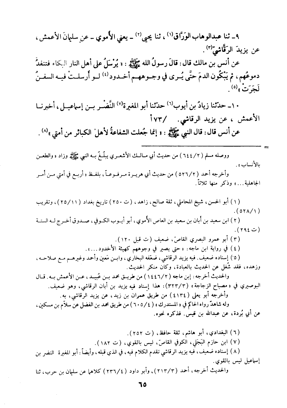 10 - حَدَّثَنَا زِيَادُ بْنُ أَيُّوبَ، حَدَّثَنَا أَبُو الْمُغِيرَةِ النَّضْرُ بْنُ إِسْمَاعِيلَ، أَخْبَرَنَا الْأَعْمَشُ، عَنْ يَزِيدَ الرَّقَاشِيِّ، عَنْ أَنَسٍ قَالَ: قَالَ النَّبِيُّ صَلَّى اللهُ عَلَيْهِ وَسَلَّمَ: «§إِنَّمَا جُعِلَتِ الشَّفَاعَةُ لِأَهْلِ الْكَبَائِرِ مِنْ أُمَّتِيِ»