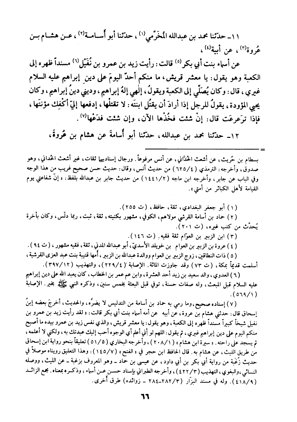 11 - حَدَّثَنَا مُحَمَّدُ بْنُ عَبْدِ اللَّهِ الْمُخَرِّمِيُّ، حَدَّثَنَا أَبُو أُسَامَةَ، عَنْ هِشَامِ بْنِ عُرْوَةَ، عَنْ أَبِيهِ، عَنْ أَسْمَاءَ بِنْتِ أَبِي بَكْرٍ قَالَتْ: رَأَيْتُ زَيْدَ بْنَ عَمْرِو بْنِ نُفَيْلٍ مُسْنِدًا ظَهْرَهُ إِلَى الْكَعْبَةِ وَهُوَ يَقُولُ: " يَا مَعْشَرَ قُرَيْشٍ , §مَا مِنْكُمْ أَحَدٌ الْيَوْمَ عَلَى دِينِ إبْرَاهِيمَ عَلَيْهِ السَّلَامُ غَيْرِي قَالَ: وَكَانَ يُصَلِّي إِلَى الْكَعْبَةِ , وَيَقُولُ: إِلَهِي إِلَهُ إِبْرَاهِيمَ , وَدِينِي دِينُ إِبْرَاهِيمَ , وَكَانَ يُحْيِي الْمَوْؤُدَةَ يَقُولُ لِلرَّجُلِ إِذَا أَرَادَ أَنْ يَقْتُلَ ابْنَتَهُ: لَا تَقْتُلْهَا ادْفَعْهَا إِلَيَّ أَكْفِكَ مُؤْنَتَهَا , فَإِذَا تَرَعْرَعَتْ قَالَ: إِنْ شِئْتَ فَخُذْهَا الْآنَ , وَإِنْ شِئْتَ فَدَعْهَا "